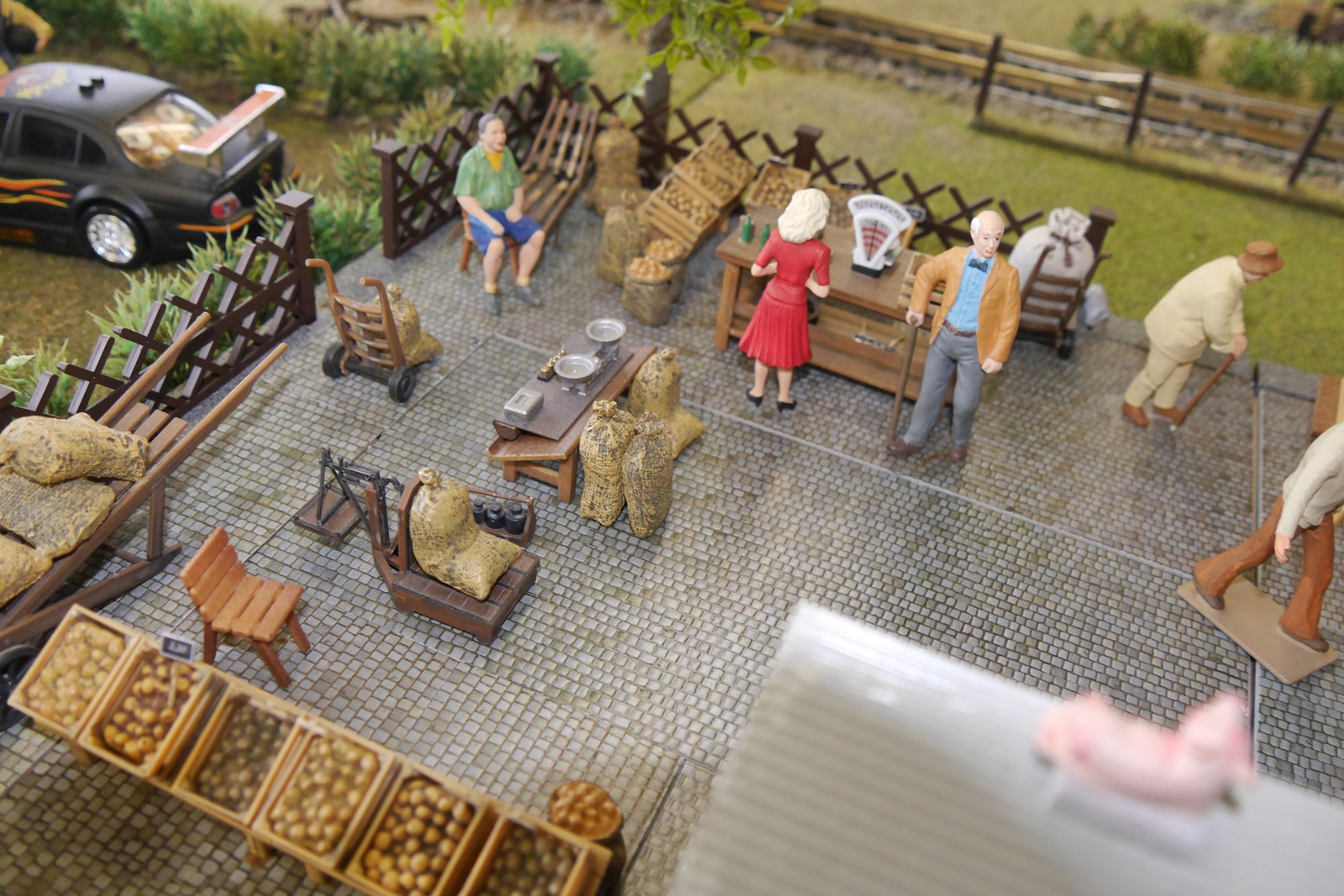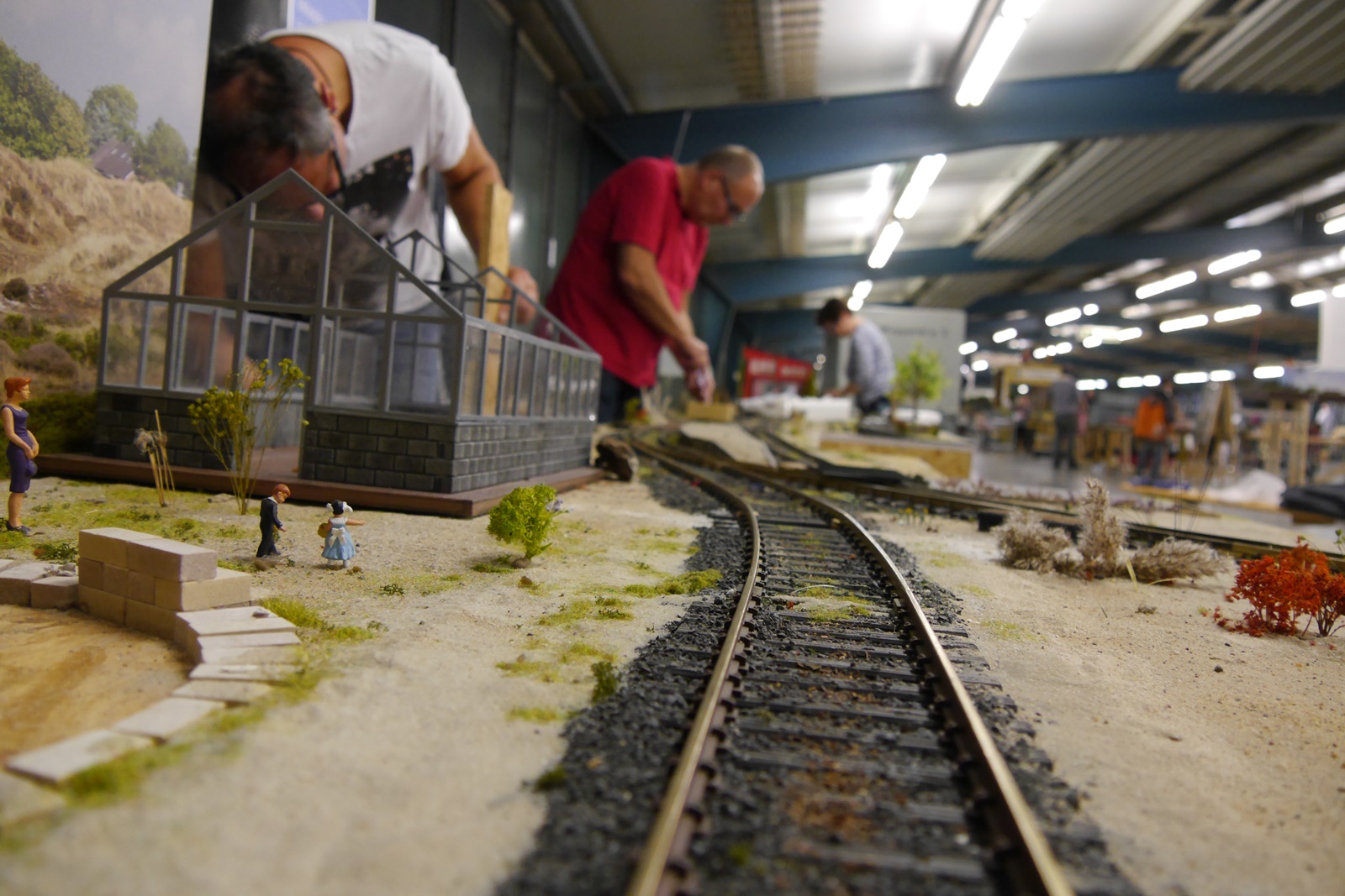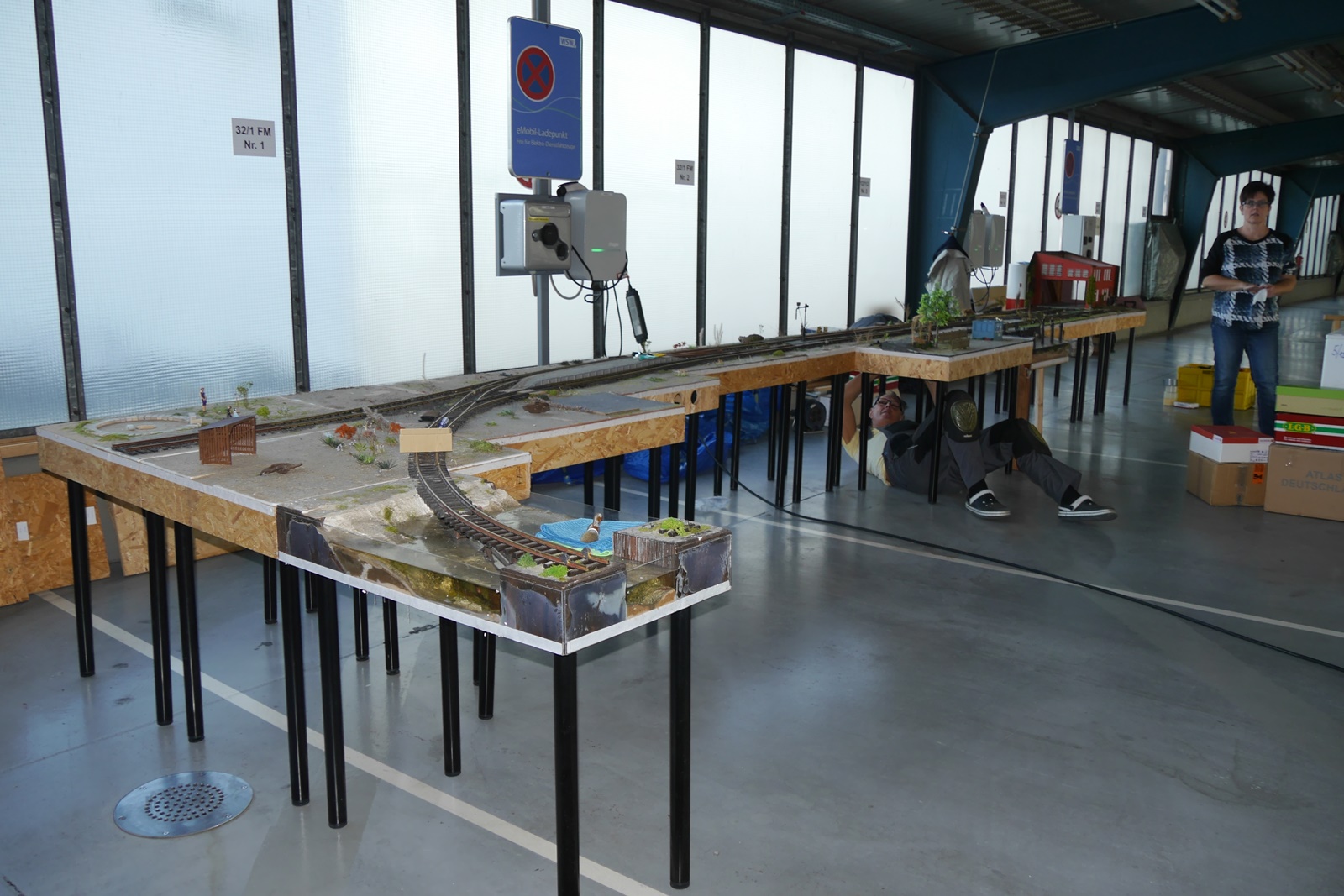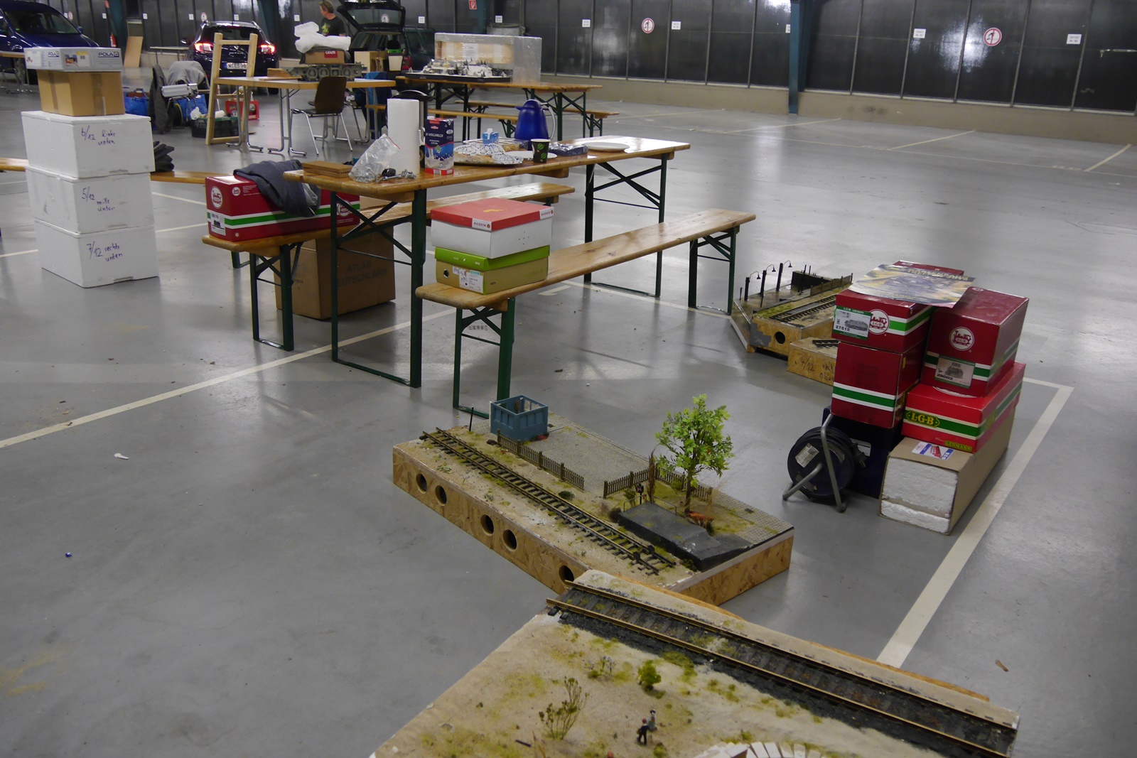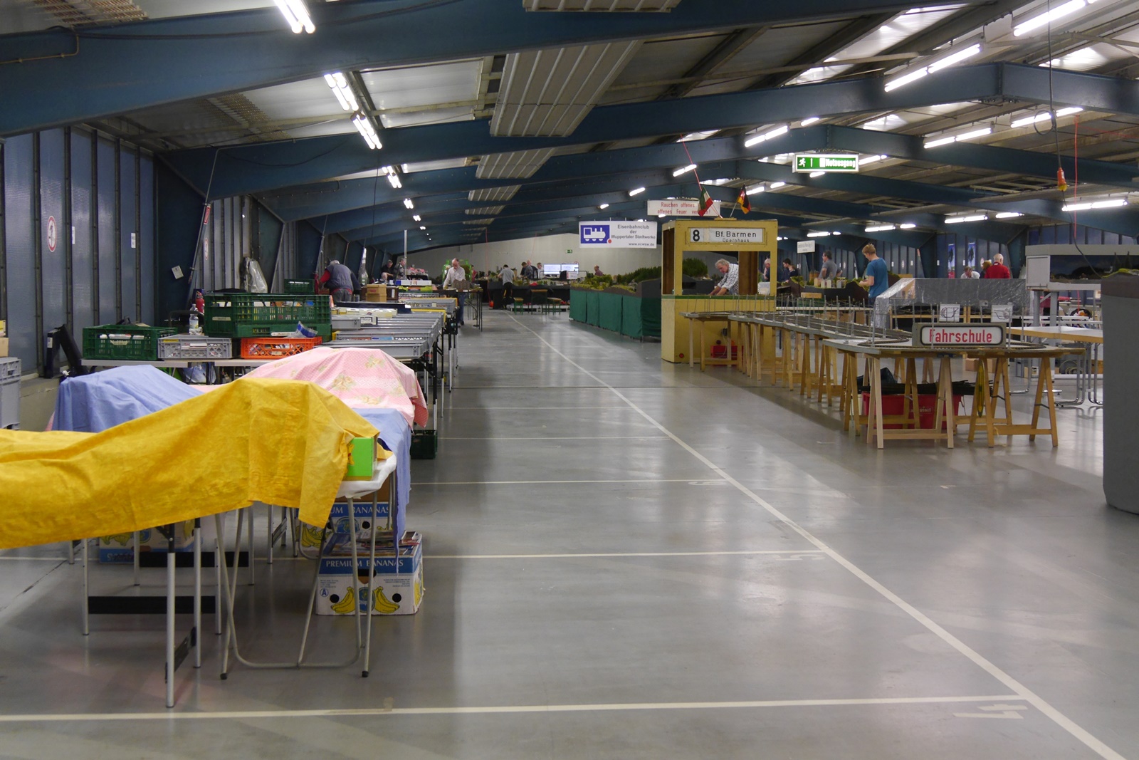 In der großen Fahrzeughalle (Parkhaus) war an diesem Tag viel los, da alle Aussteller ihre Stände bzw. Modellbahnen aufbauen mussten. Am Ende des Tages war alles fertig für die Besucher: