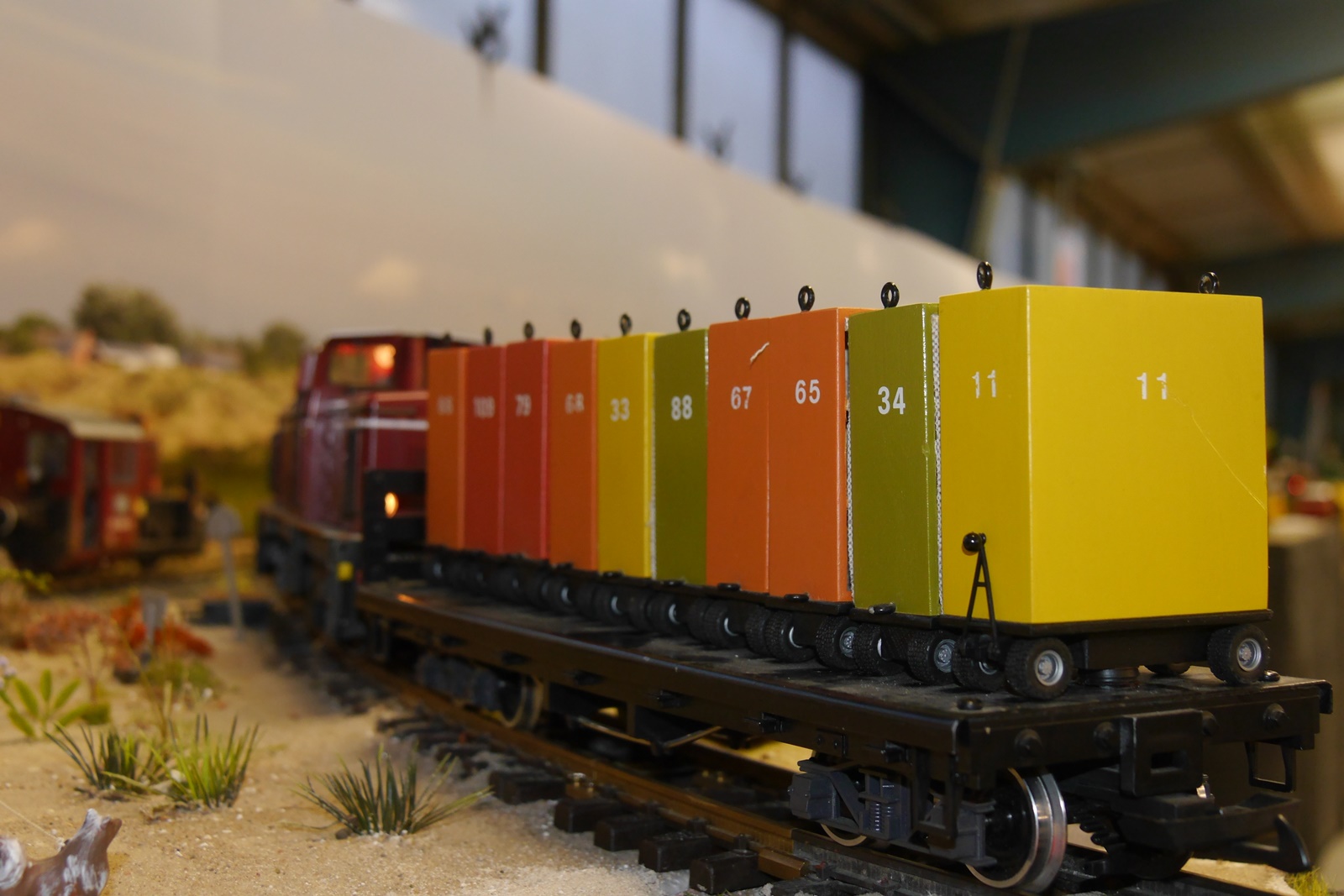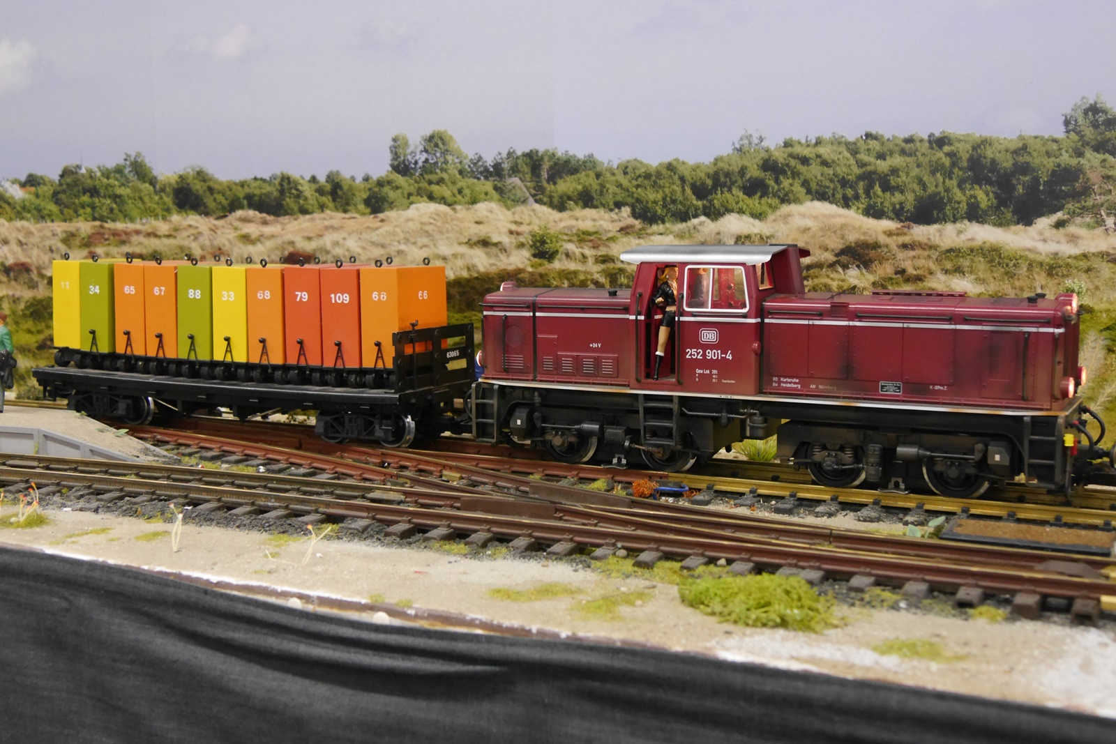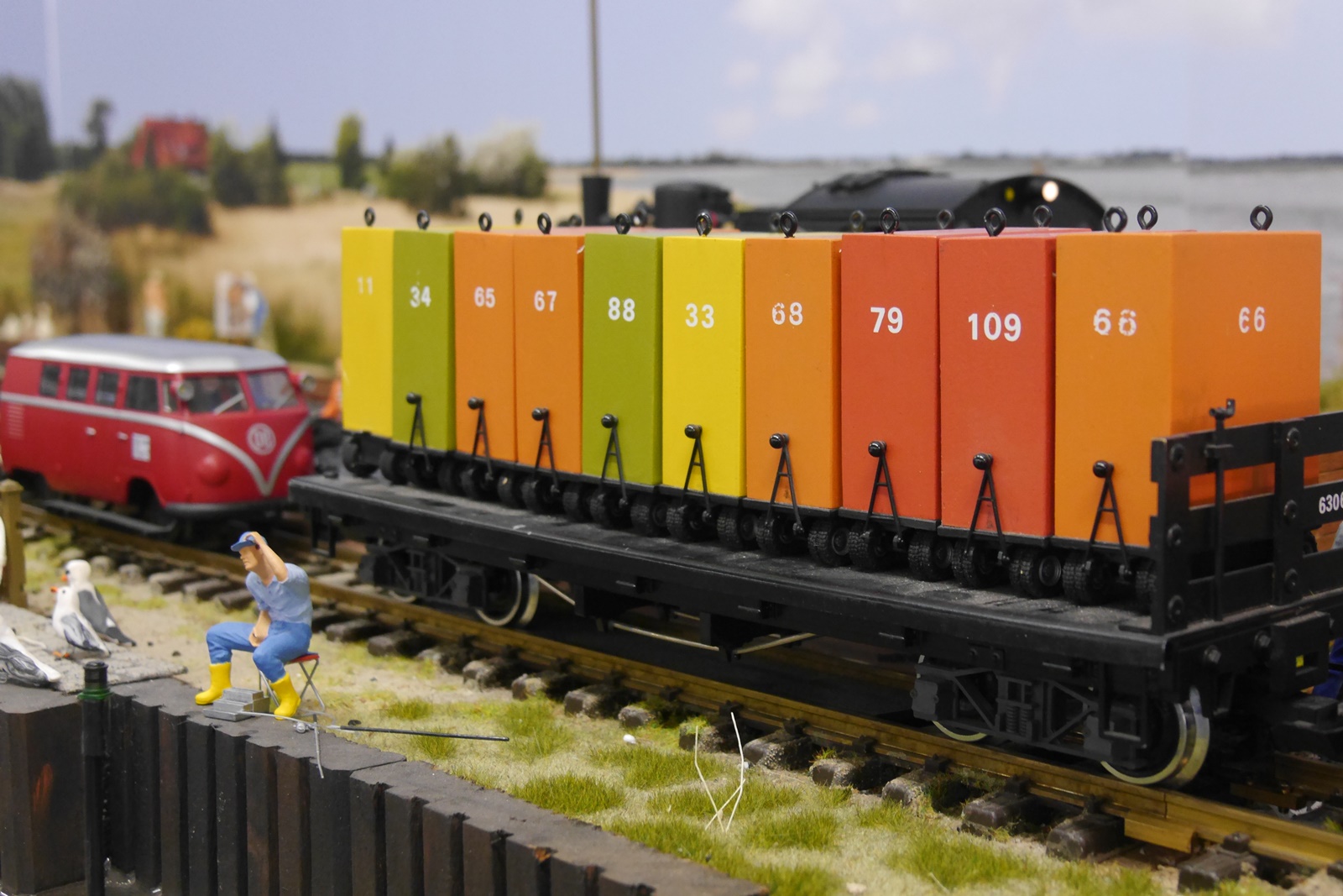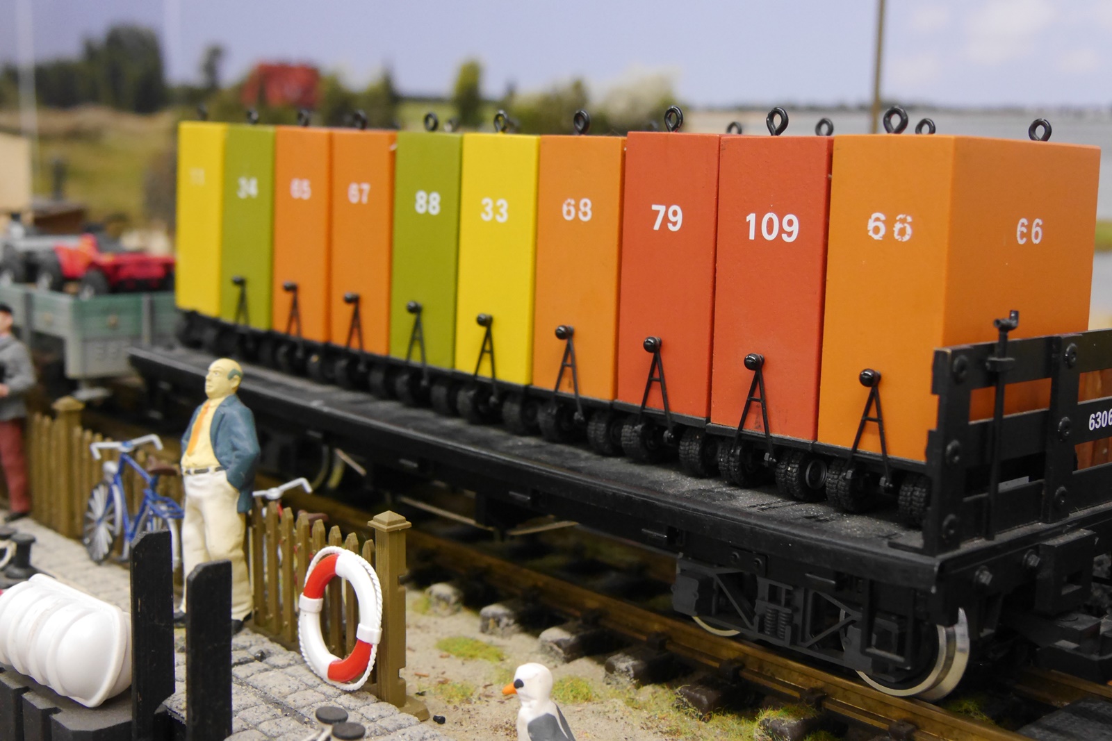 einen Wagen mit Koffercontainern, wie er auch heute noch für den Reiseverkehr nach Wangerooge benutzt wird. Die Koffercontainer werden auf Wangerooge vom Schiff auf den Inselbahnzug (bzw. umgekehrt)