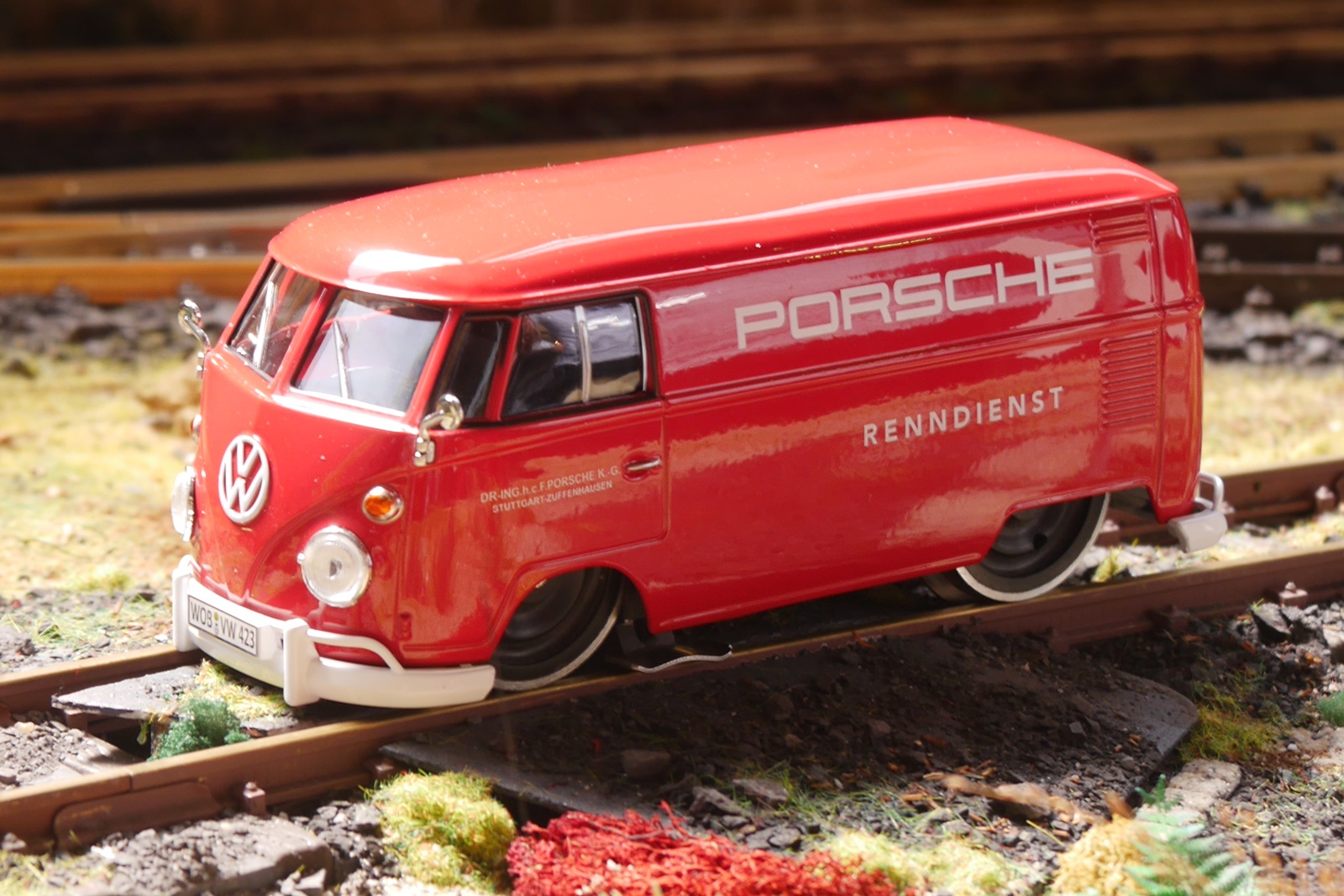 Ein VW Bulli aus dem Porsche Renndienst war außerdem zu Gast; so entstanden schöne Bilder, die diesen tollen Eigenbau auf der Nordseeanlage - u.a. neben dem T1 Serienmodell von Brekina - zeigen.