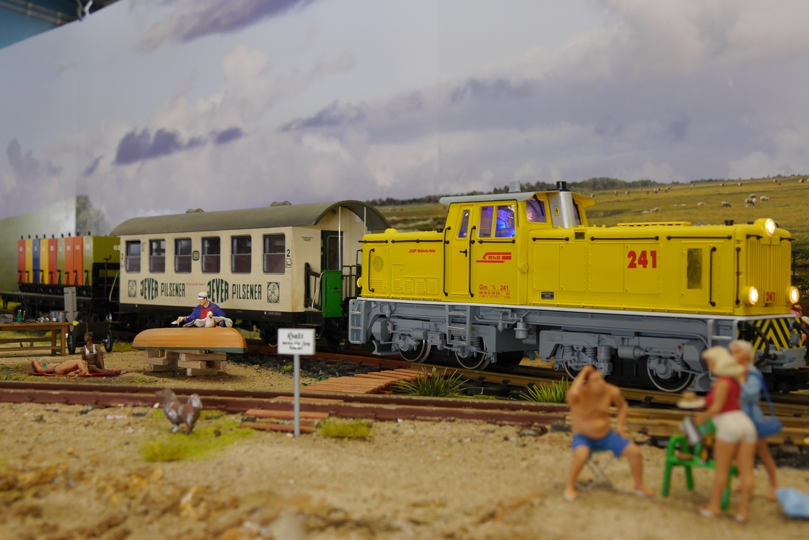 Am Samstag waren kurzzeitig ein paar Straßenbahnen an der Norsee zu sehen; am Sonntag war Torsten Appeltrath mit seiner VI-K, dem Schlepptriebwagen T33 und einer Mallet unterwegs. Für eine kurze Zeit war die gelbe RhB-Diesellok von Hans-Bernd Hülsbömer auf der Anlage unterwegs: