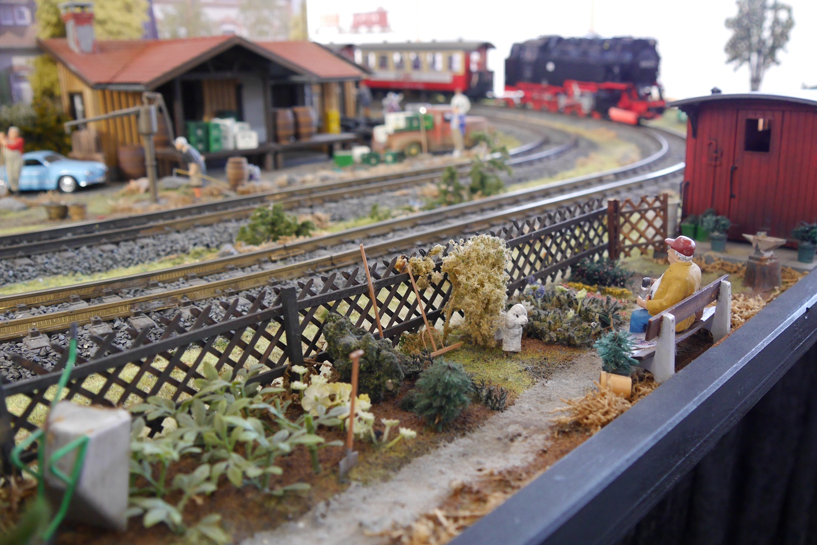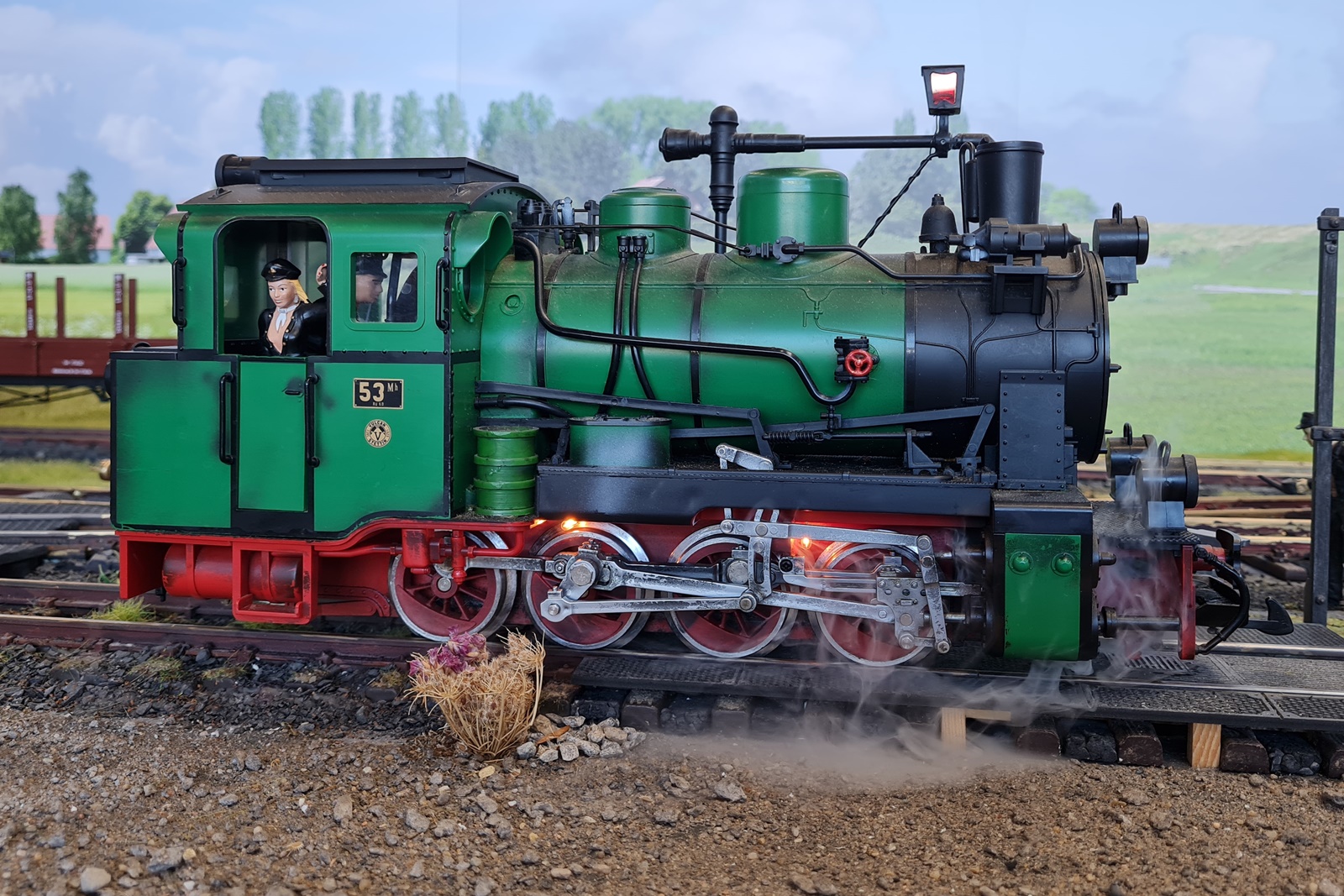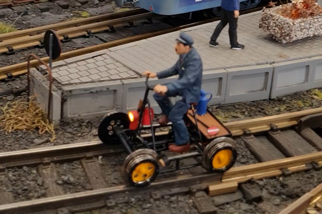 Leider gab es nur weinige Besucher mit Gastfahrzeugen. Lediglich der T1 aus dem Hause Trainline war auf der Anlage unterwegs. Außerdem war kurz ein funktionsfähiges Modell eines Schienenfahrrades zu sehen: