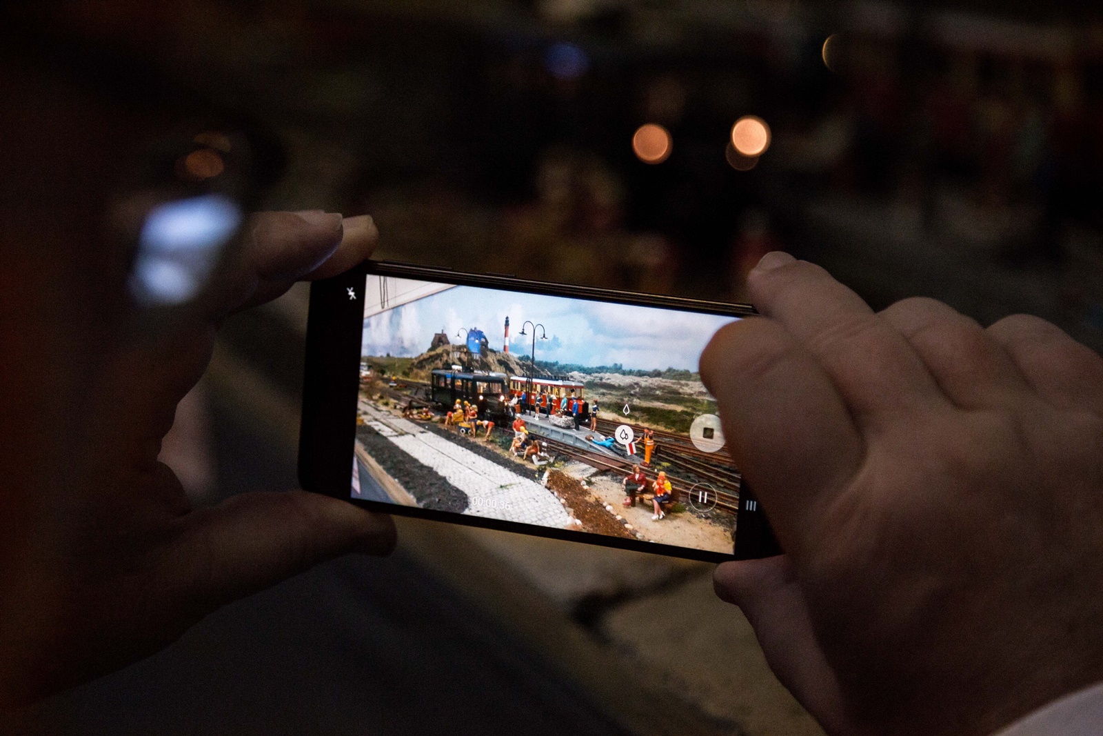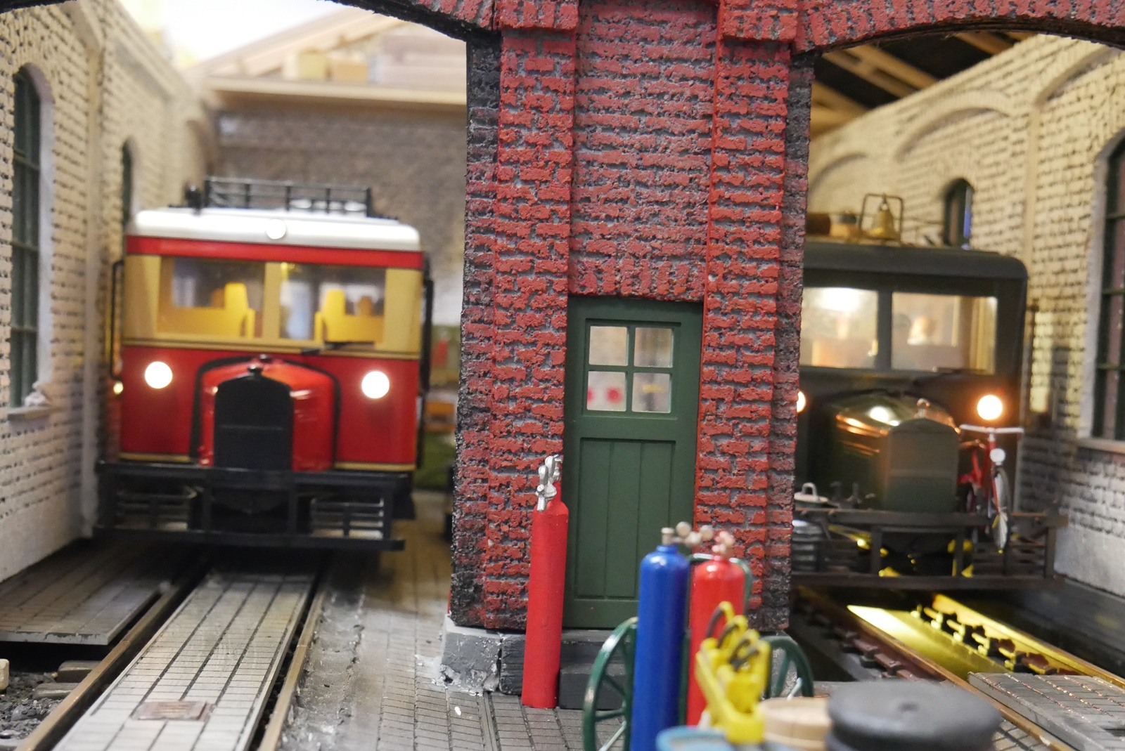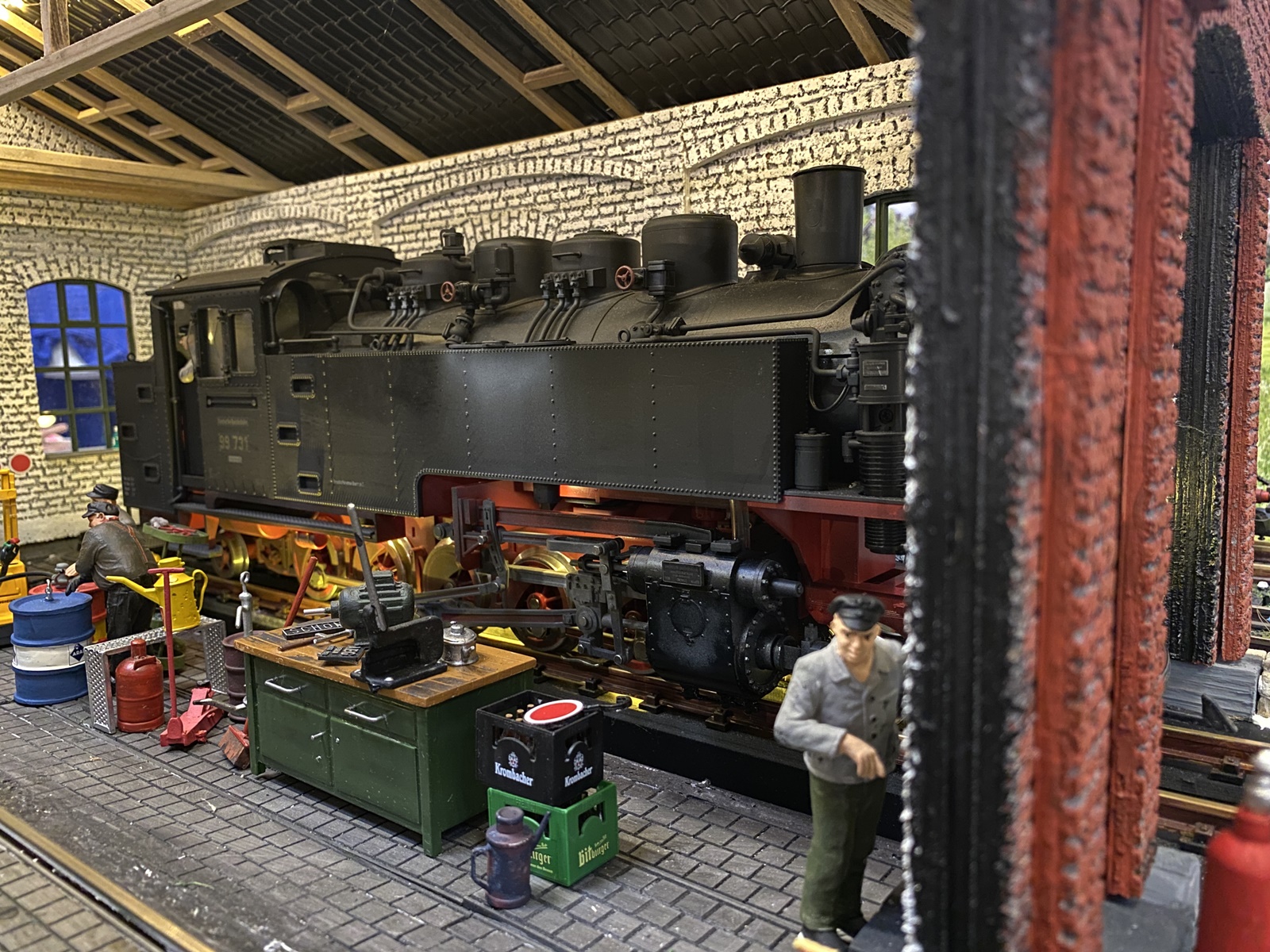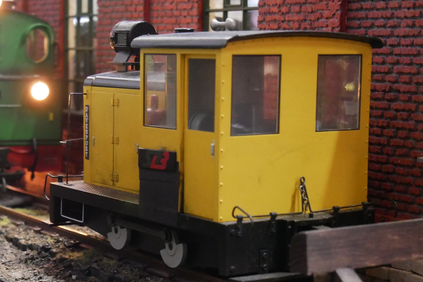 Ein Altbau-E-Lok in Spur 1 von Dieter Oehme war zu einer Probefahrt auf der Anlage unterwegs; ebenso ein Güterwagen von Stefan Heussen, der einen Rangierer mit leuchtender Lampe hatte.