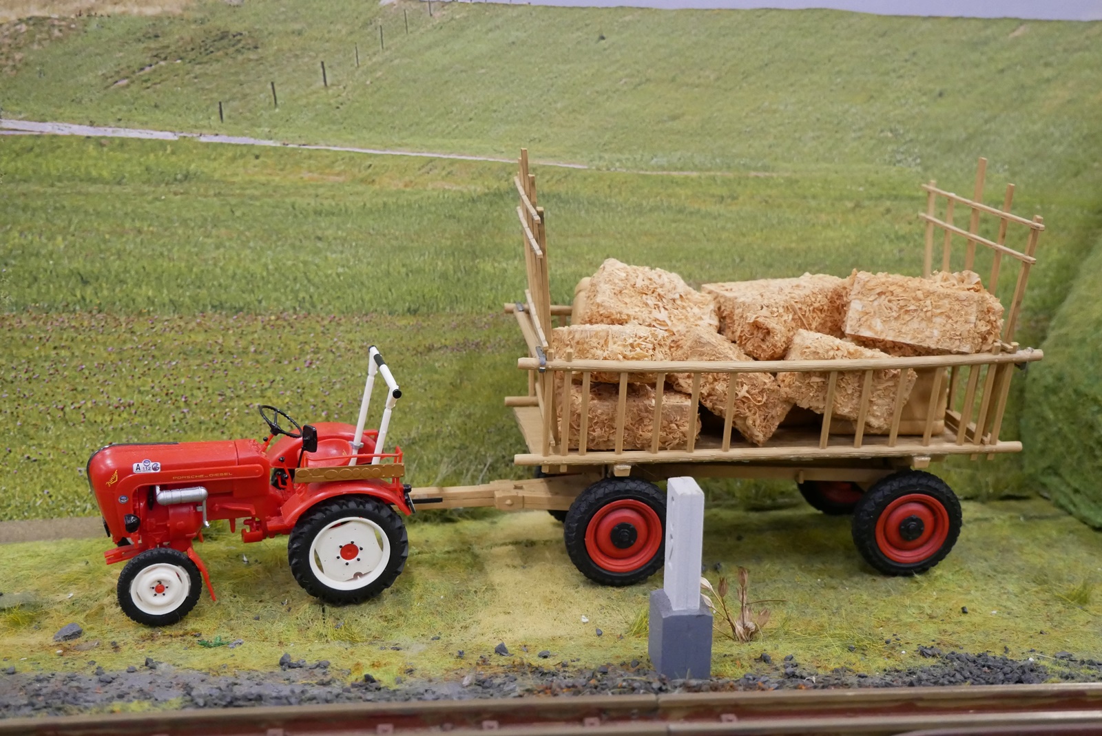 Es waren einige Gastfahrzeuge unterwegs. U.a. fuhr die kleine Emma von Andy über die Gleise. Der Traktor hat einen Heuwagen von Stefan angehängt bekommen.
