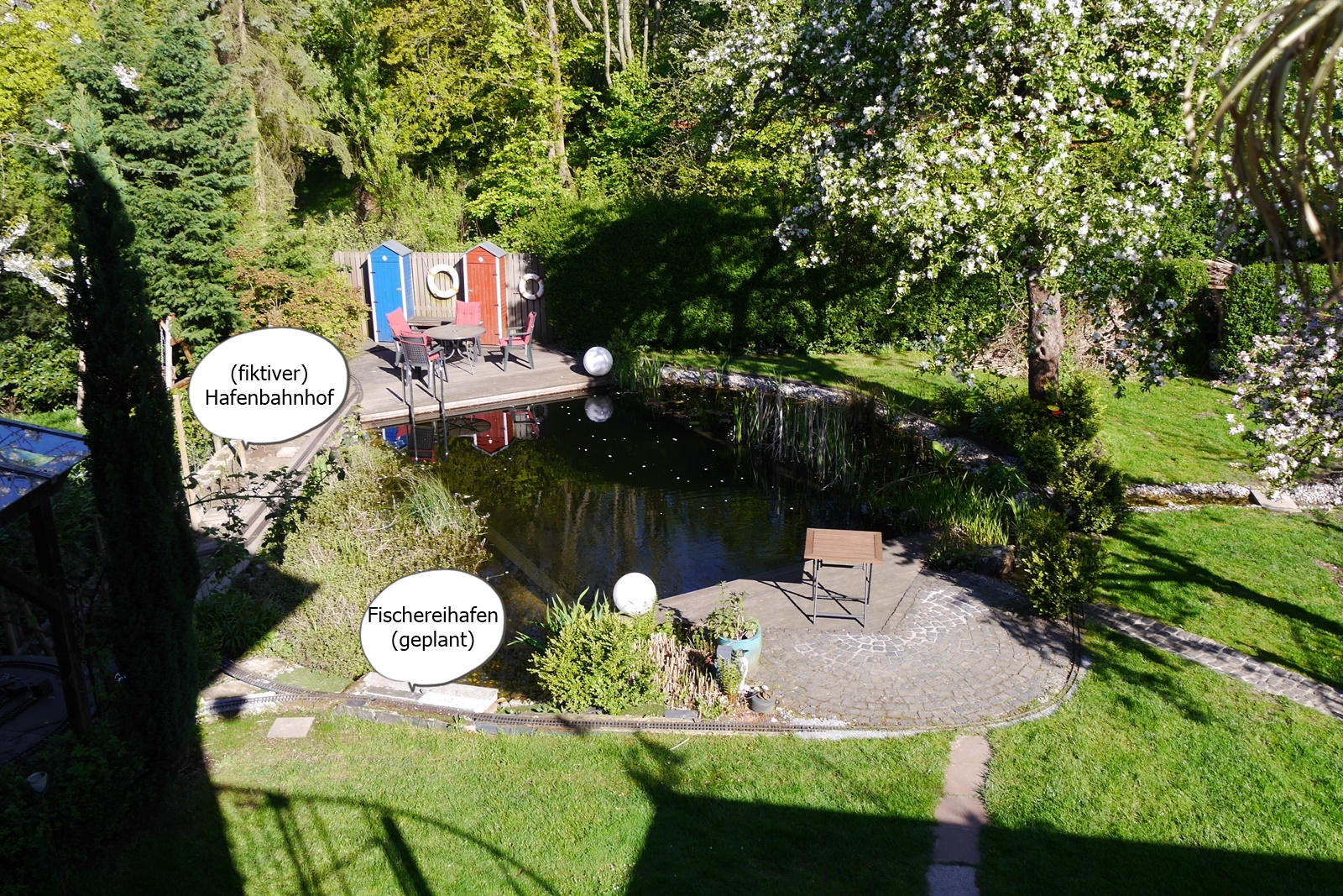 Das folgende Bild zeigt die Rundstrecke im Garten. Im vorderen Teil ist ein kleiner Haltepunkt an einem Fischereihafen geplant.