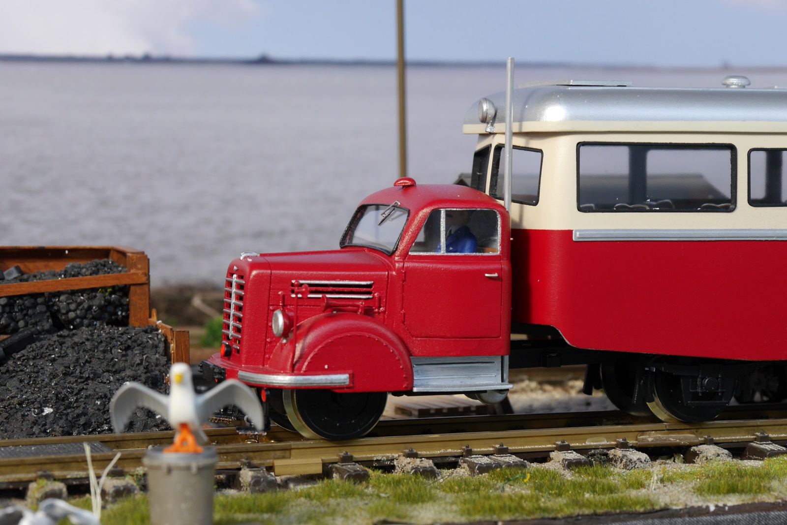 Das Vorbild hat zwar niemals die Nordsee gesehen, trotzdem ist die kleine Diesellok jetzt auf der Feldhauser Kleinbahn zu finden. Wie die Vorbildlok ist das Modell ein Regelspurmodell; d.h. die Lok fährt auf 64 mm Gleisen, welches der Regelspur im Maßstab 1:22,5 entspricht.