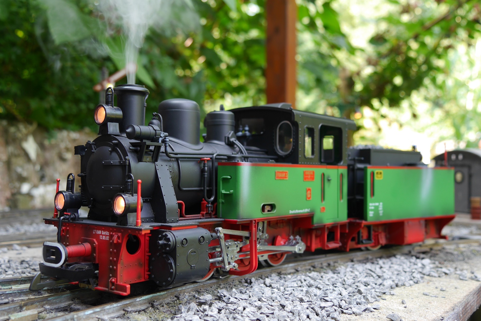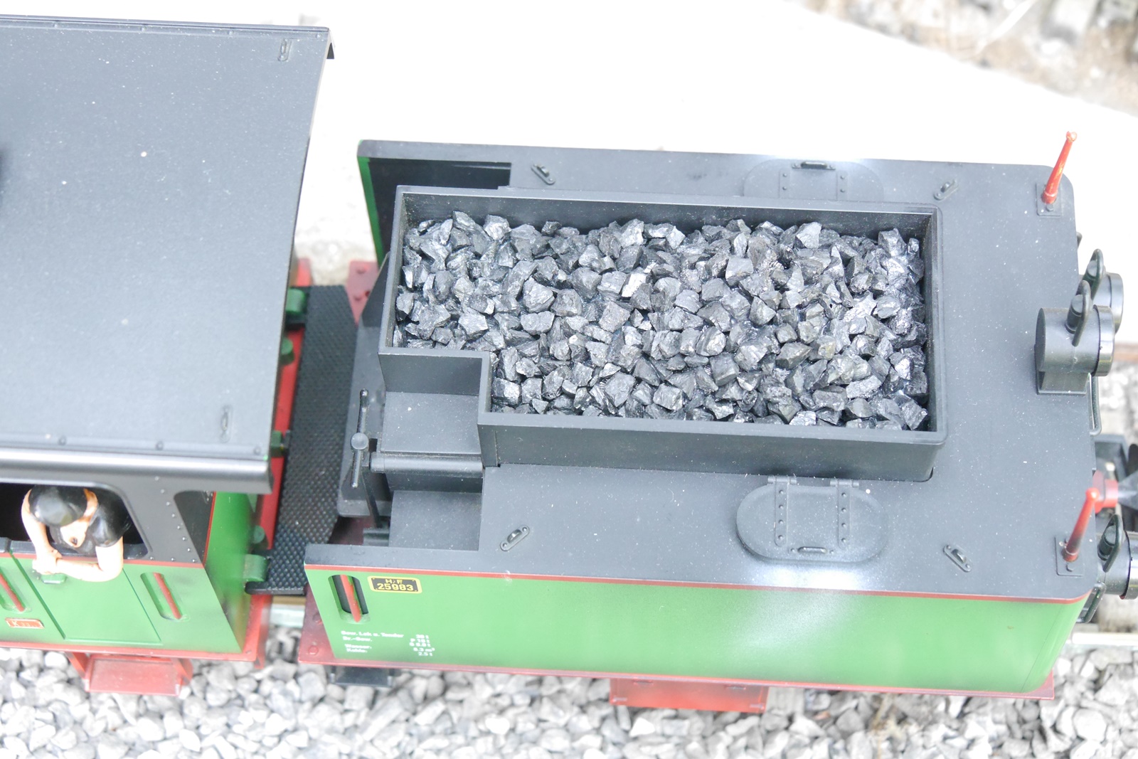 Das Modell ist von LGB. Da das Vorbild auf 750 mm Spurweite fährt, ist das Modell etwas zu groß - bezogen auf den Maßstab 1:22,5. Die Lok ist mit zwei Motoren ausgestattet und sehr zugkräftig. Sie verfügt werkseitig über Sound, Impulsdampf (Schonstein + Zylinder), Kesselfeuer und Fahrwerksbeleuchtung.