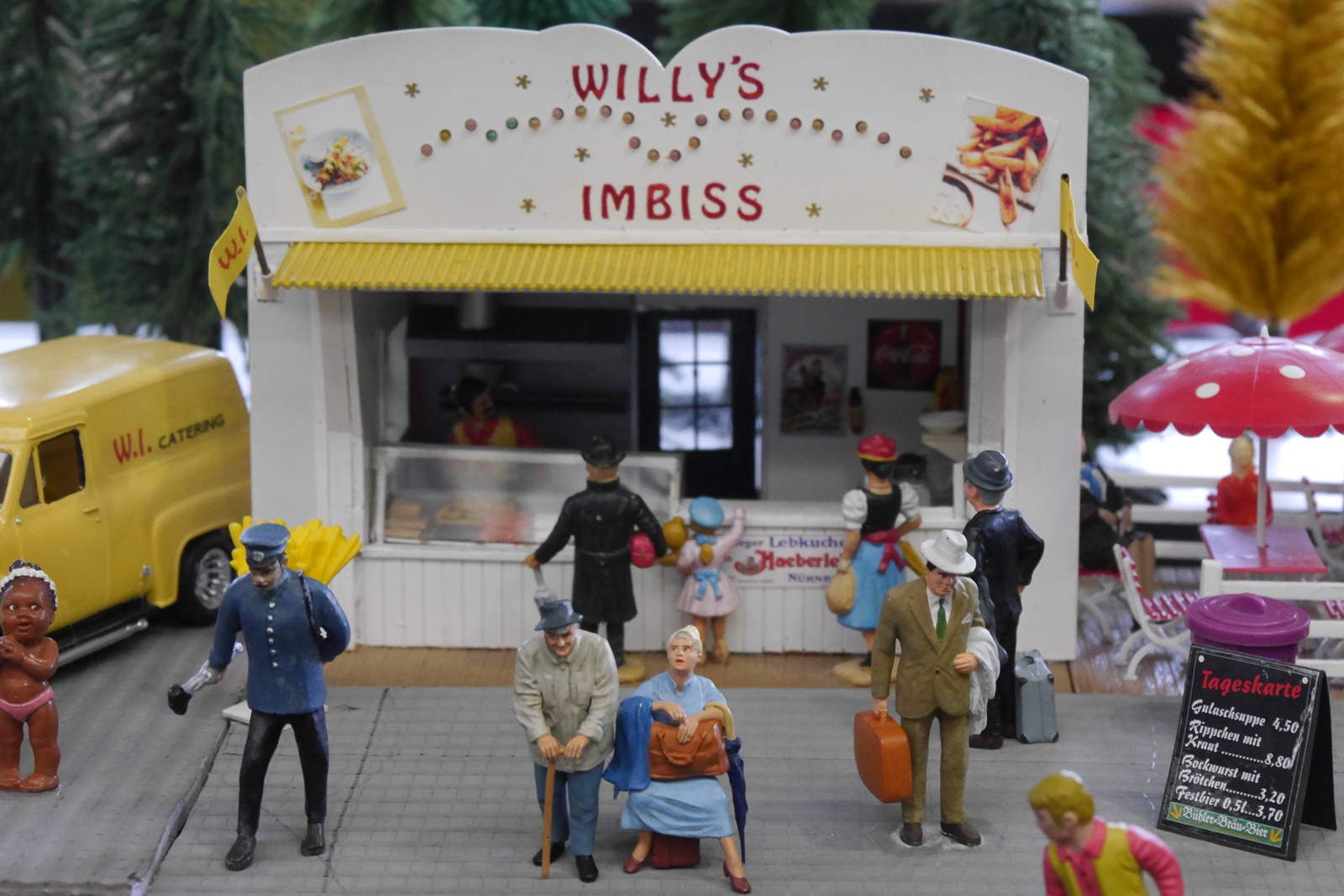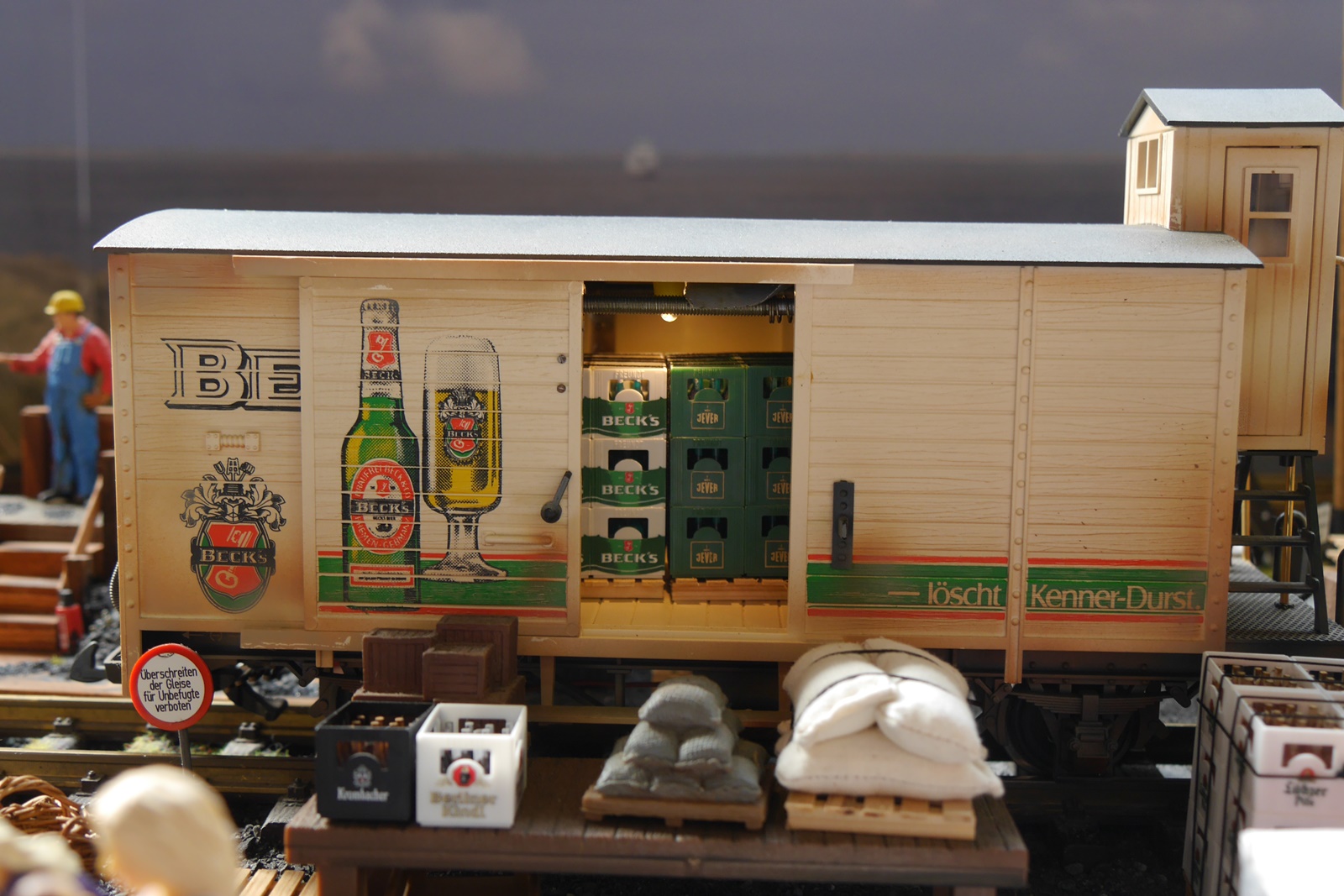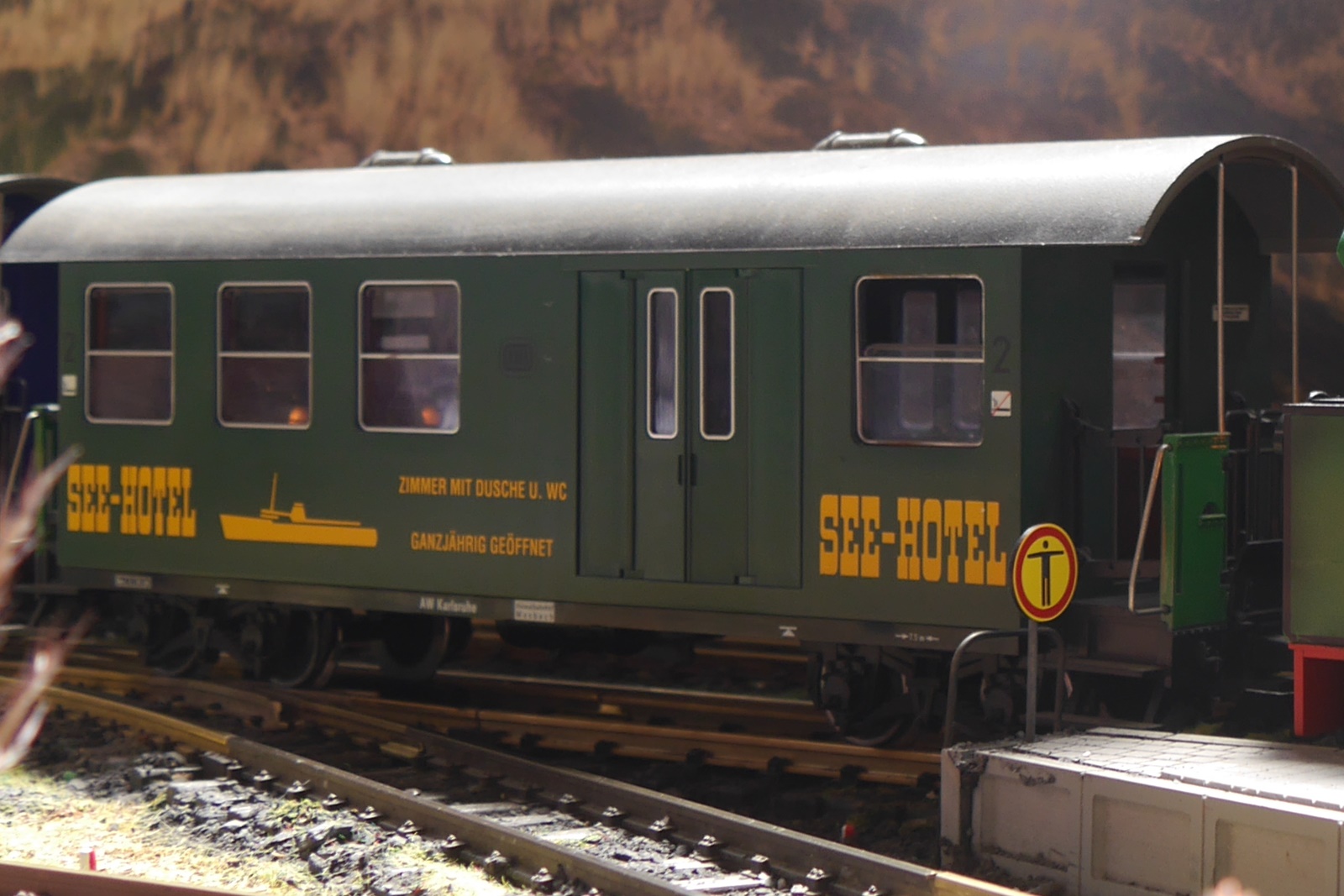 Wie immer bei Veranstaltungen dieser Art, finden sich auch Gastfahrzeuge ein. So hat Stuhli (Friedhelm Stuhlmann) nicht nur die Anlage mit seinen Modulen erweitert, sondern auch einige Fahrzeuge des "Wangerooge Zuges" der LGB Anlage der Wuppertaler Stadtwerke (Diesellok, Personenwagen "Seehotel" und ein Koffertransportwagen) mitgebracht. Auch der Trabbi mit Fahrer stammt aus der Sammlung von Stuhli.