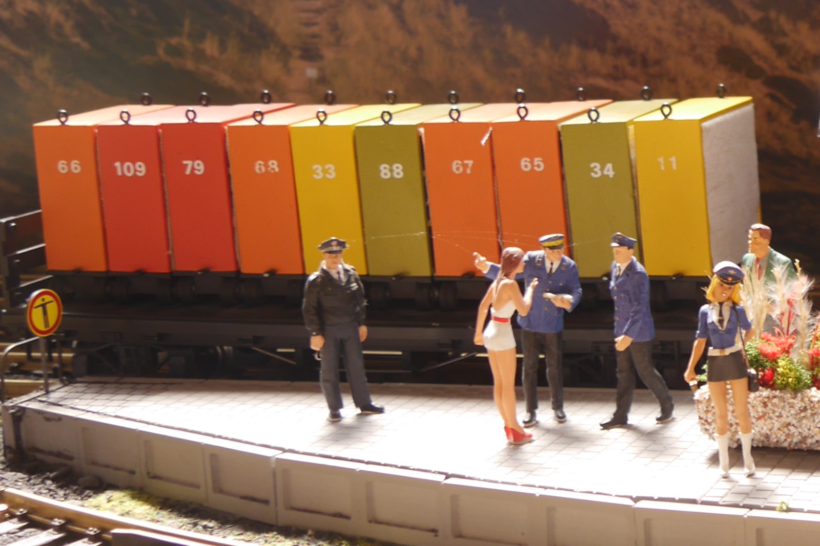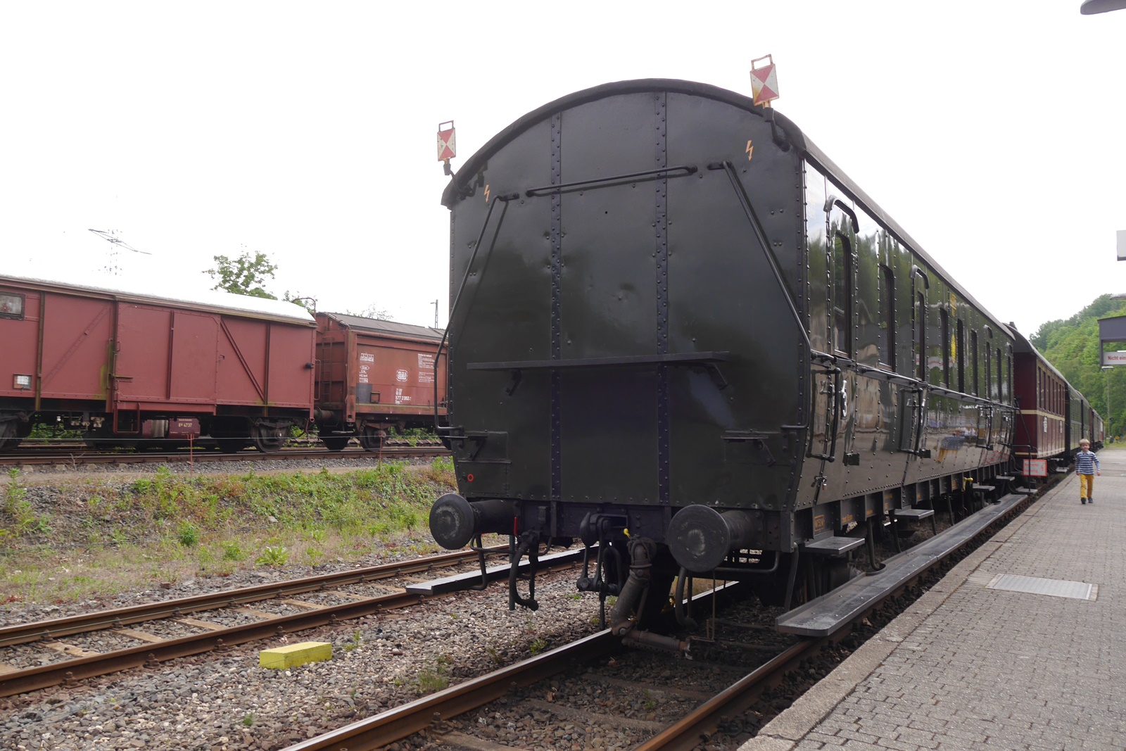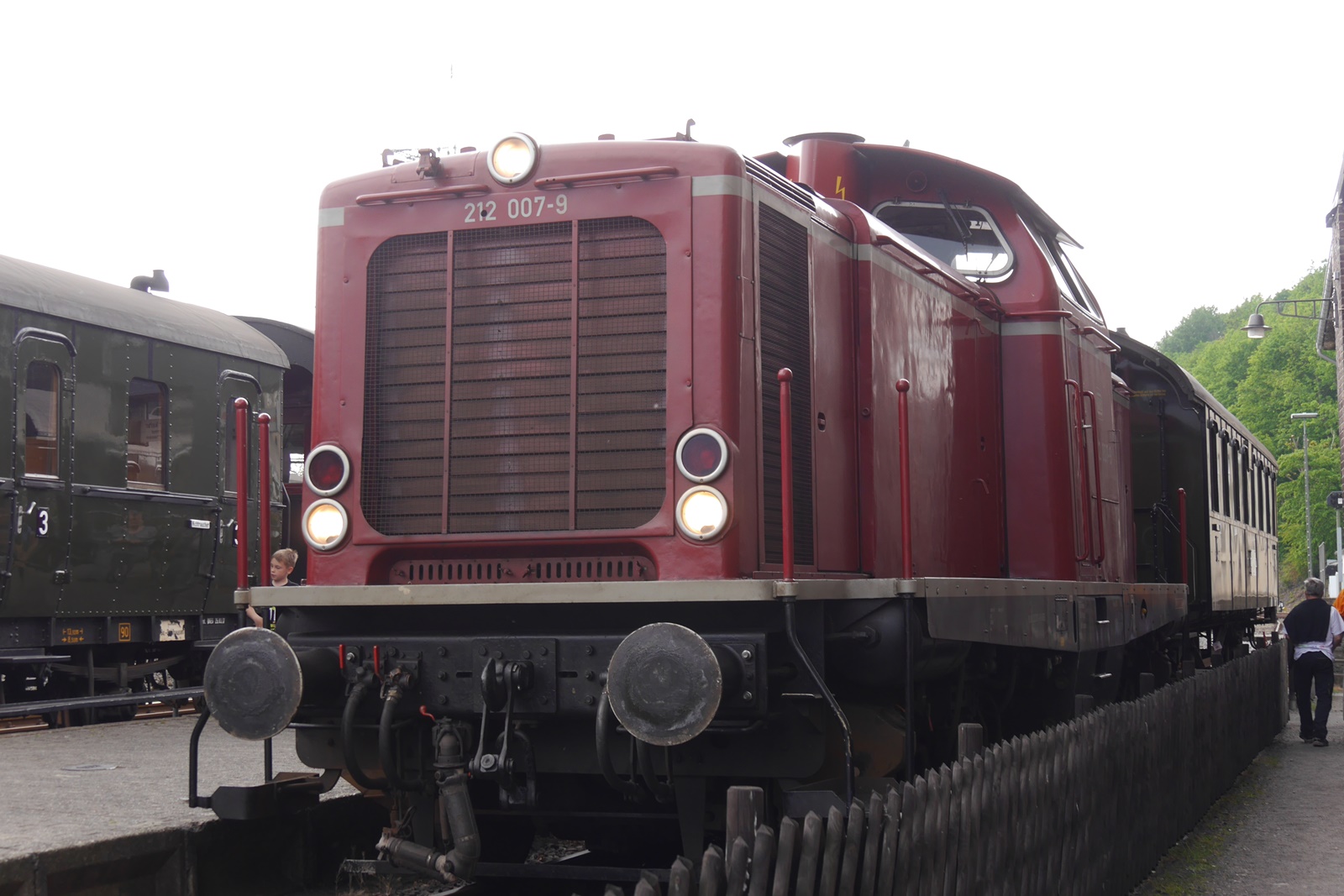 Wie immer bei Veranstaltungen dieser Art, finden sich auch Gastfahrzeuge ein. So hat Stuhli (Friedhelm Stuhlmann) nicht nur die Anlage mit seinen Modulen erweitert, sondern auch einige Fahrzeuge des "Wangerooge Zuges" der LGB Anlage der Wuppertaler Stadtwerke (Diesellok, Personenwagen "Seehotel" und ein Koffertransportwagen) mitgebracht. Auch der Trabbi mit Fahrer stammt aus der Sammlung von Stuhli.