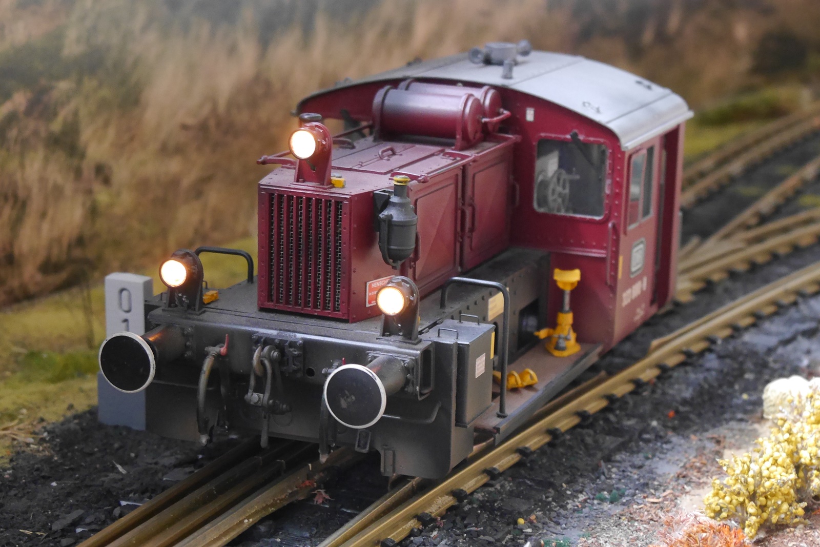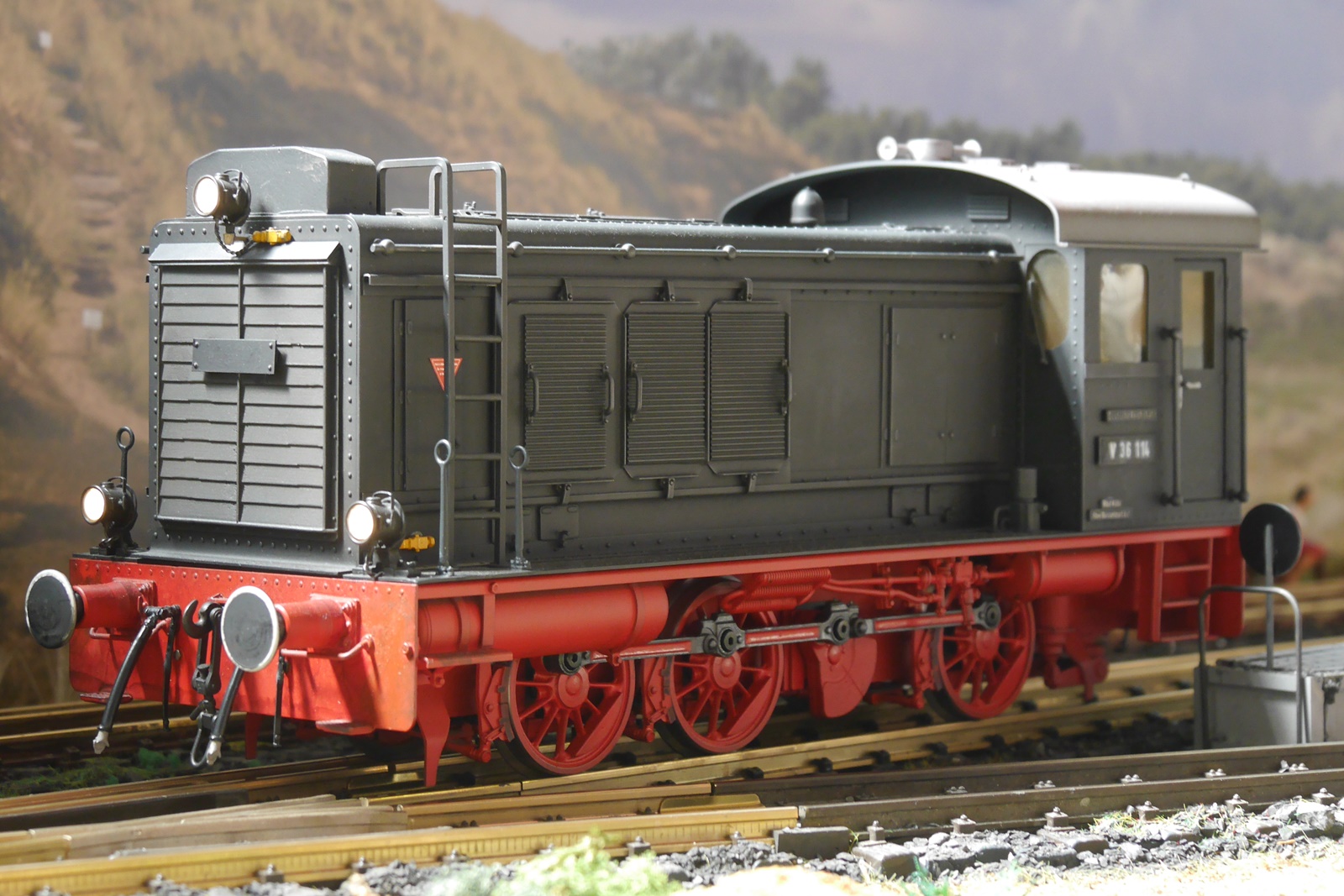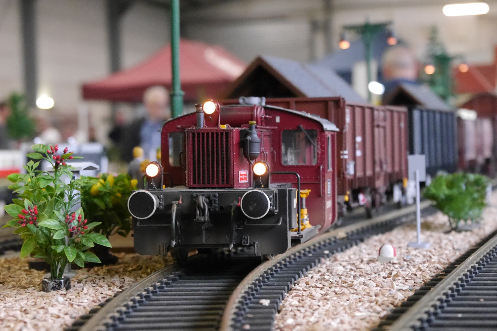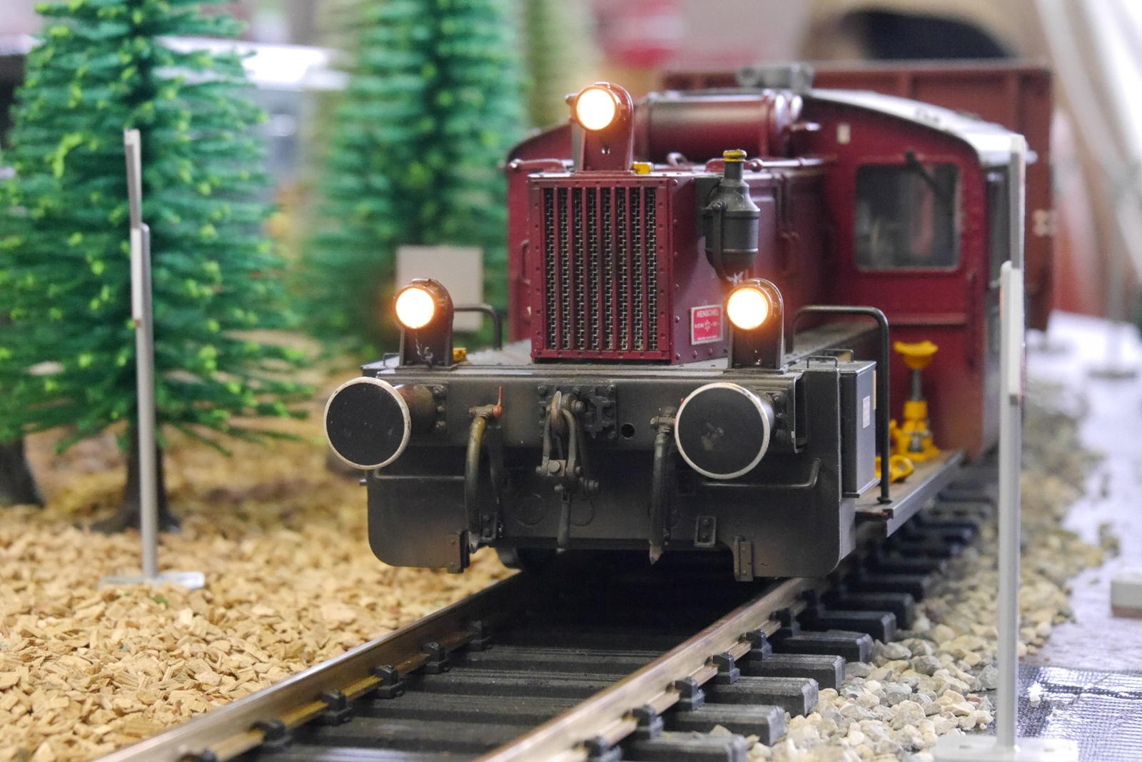 Gewichtigster Gast war eine Regelspurlok (V36) von Magnus, die das Dreischienengleis der Anlage testete und dort auf die kleine Schwester Köf2 (auch ein Modell von Magnus) traf. Die V36 ist im Besitz von Gideon vom "Spoor II Club Holland". Torsten Appelrath hatte wieder seinen Schlepptriebwagen mitgebracht.