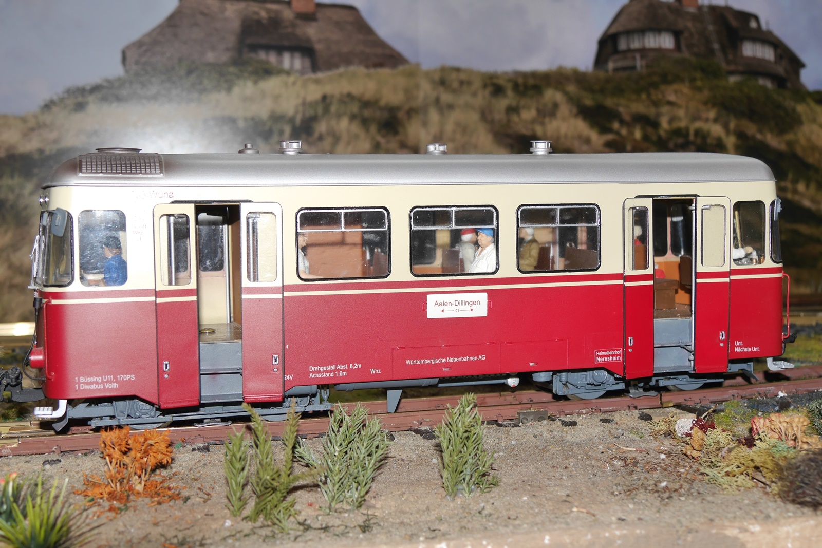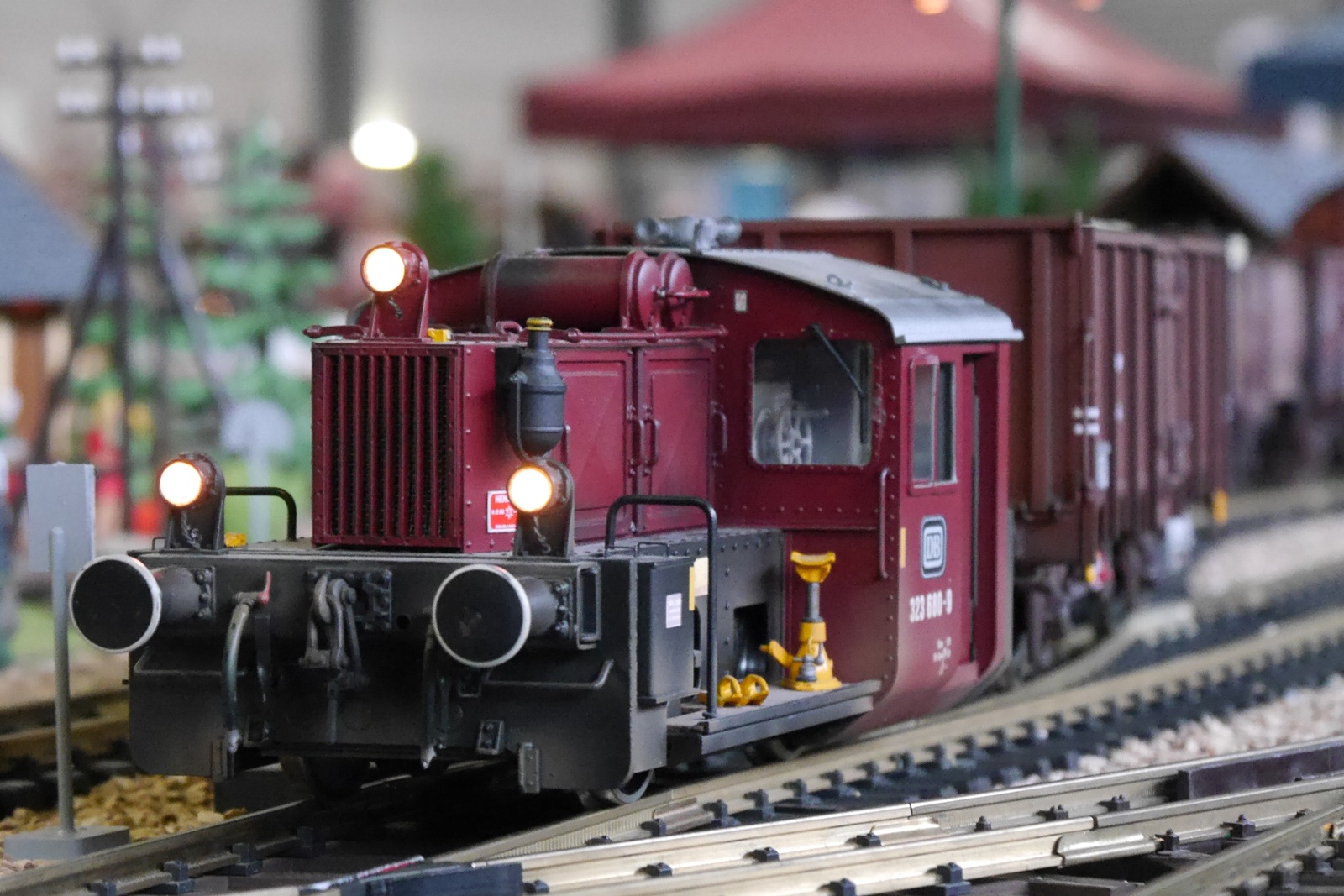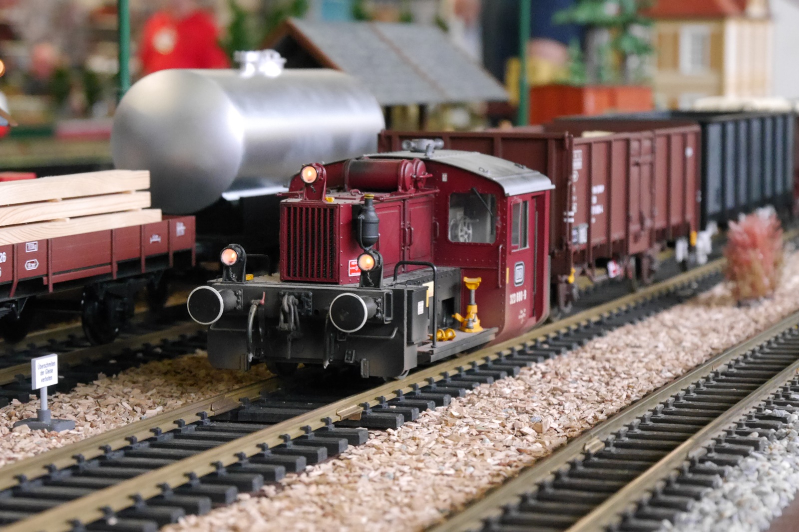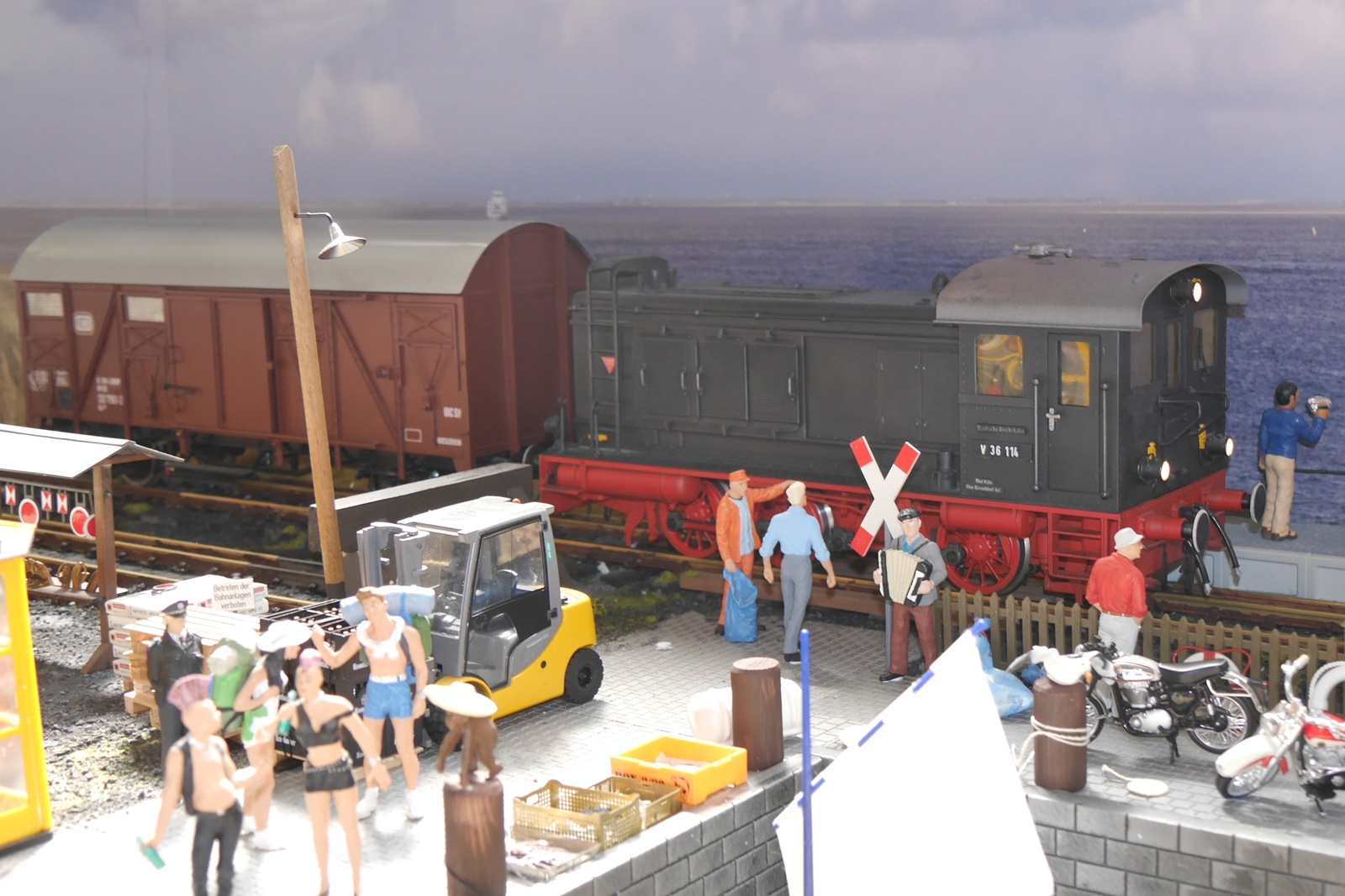 Gewichtigster Gast war eine Regelspurlok (V36) von Magnus, die das Dreischienengleis der Anlage testete und dort auf die kleine Schwester Köf2 (auch ein Modell von Magnus) traf. Die V36 ist im Besitz von Gideon vom "Spoor II Club Holland". Torsten Appelrath hatte wieder seinen Schlepptriebwagen mitgebracht.