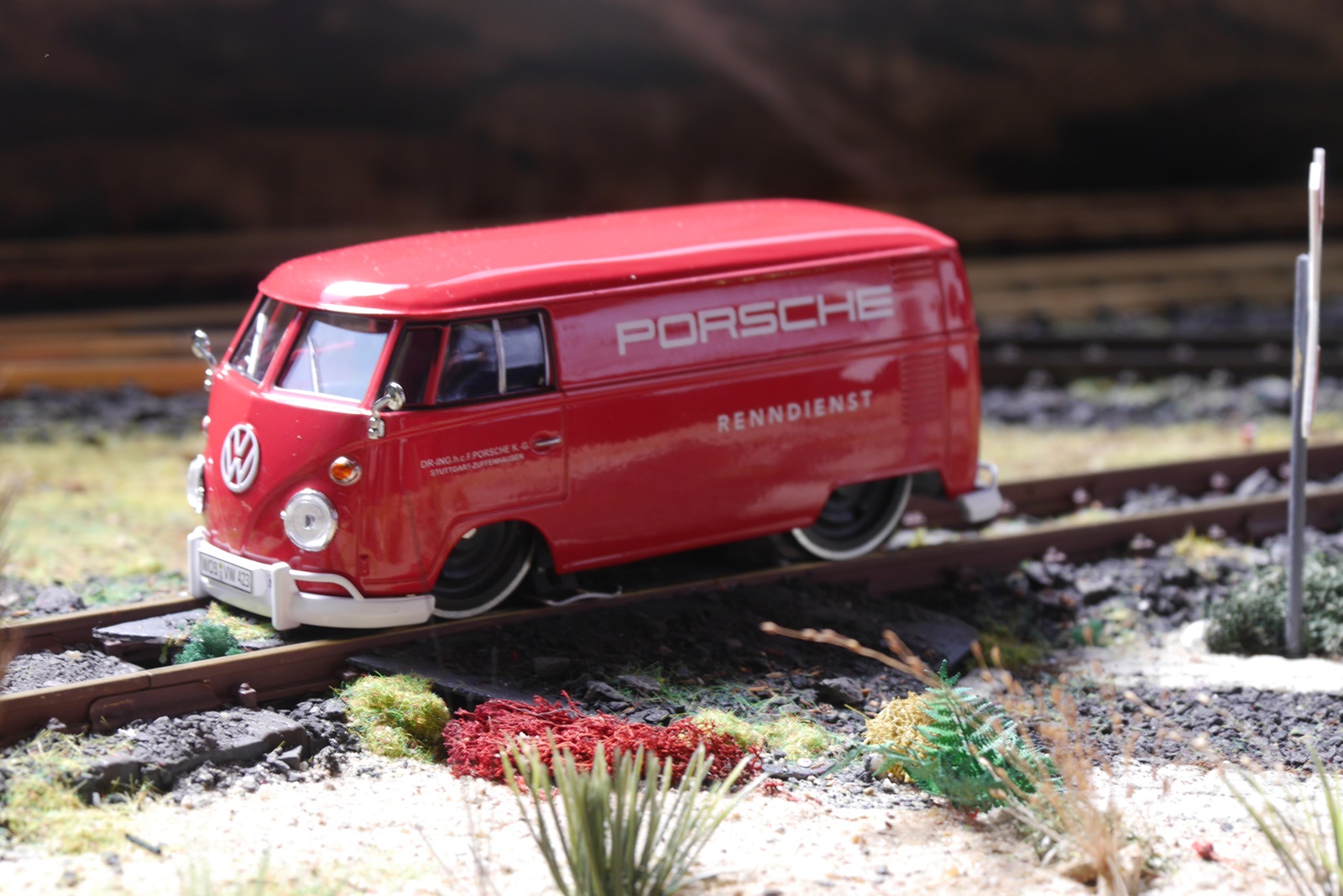 Ein VW Bulli aus dem Porsche Renndienst war außerdem zu Gast; so entstanden schöne Bilder, die diesen tollen Eigenbau auf der Nordseeanlage - u.a. neben dem T1 Serienmodell von Brekina - zeigen.