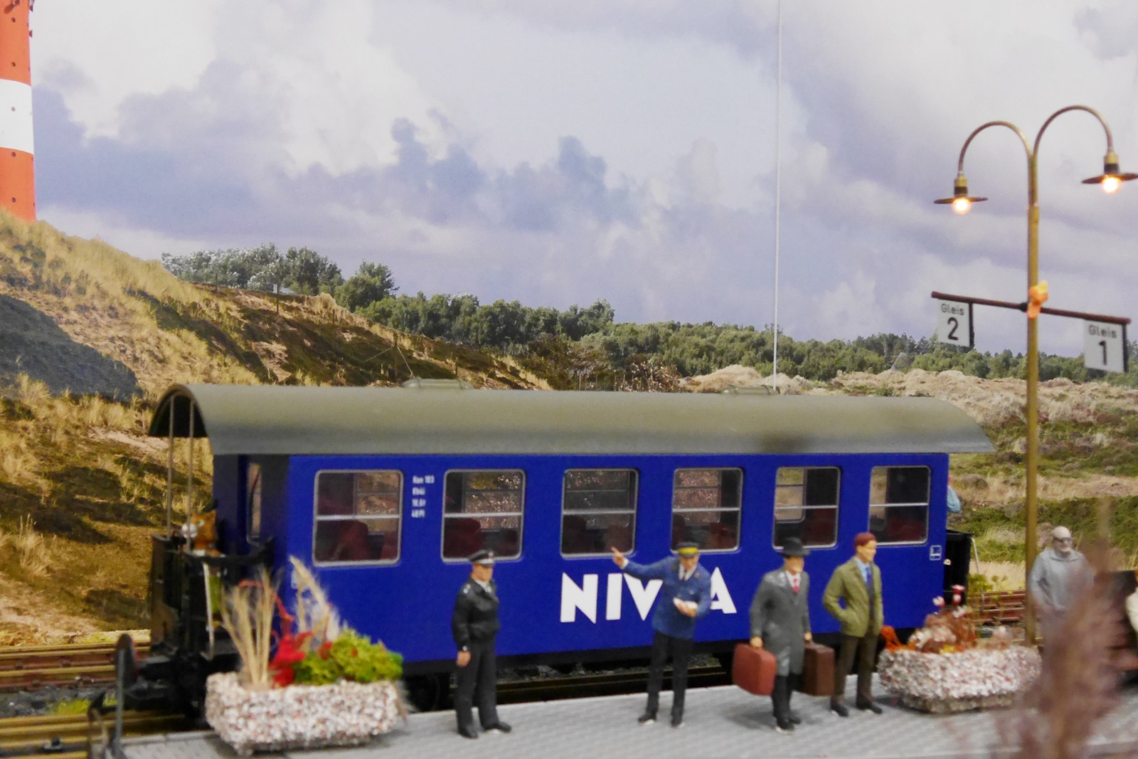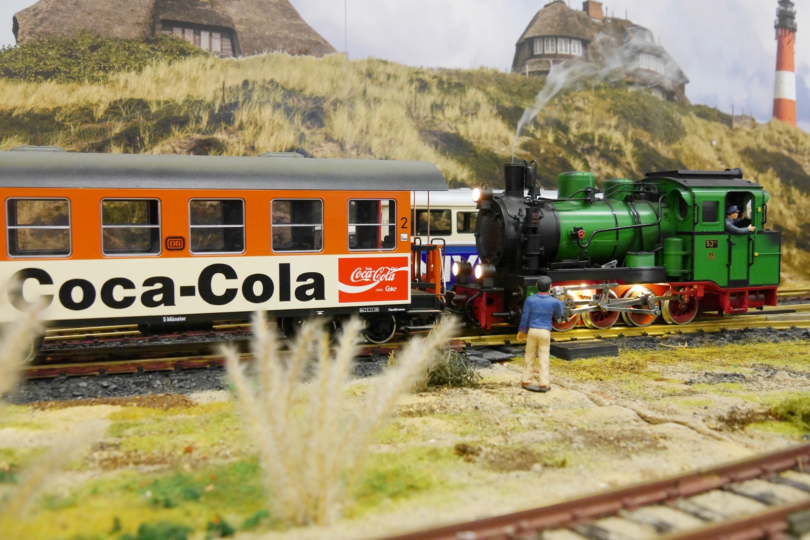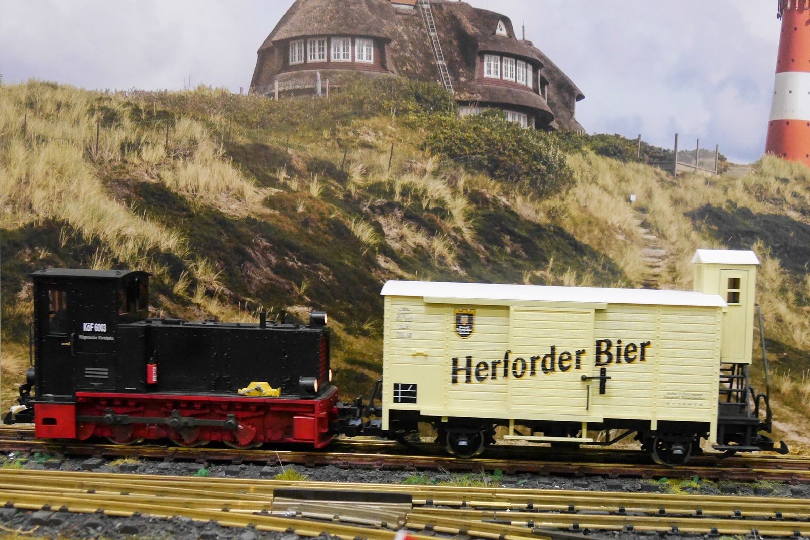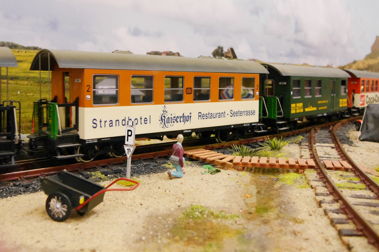 Wie so oft auf Veranstaltungen finden sich auch Gastfahrzeuge ein. Friedhelm Stuhmann (Stuhli) hat eine kleine schwarze Schmalspur-Köf, einige Inselbahnwagen (z.B. den schon bekannten Koffertransportwagen, der ganz oft zu Gast ist) und weitere Güterwagen mitgebracht. Außerdem hat er mit eigenen Modulen die Nordseeanlage um ca. 4 Meter verlängert; insbesondere die beiden Sylter Leichttriebwagen freuten sich über die Drehscheibe auf den Modulen!