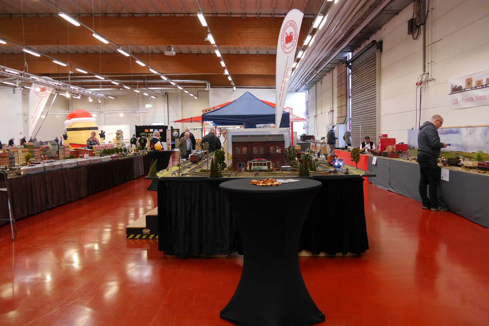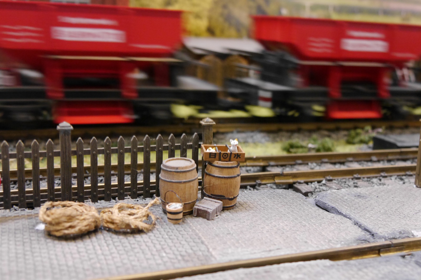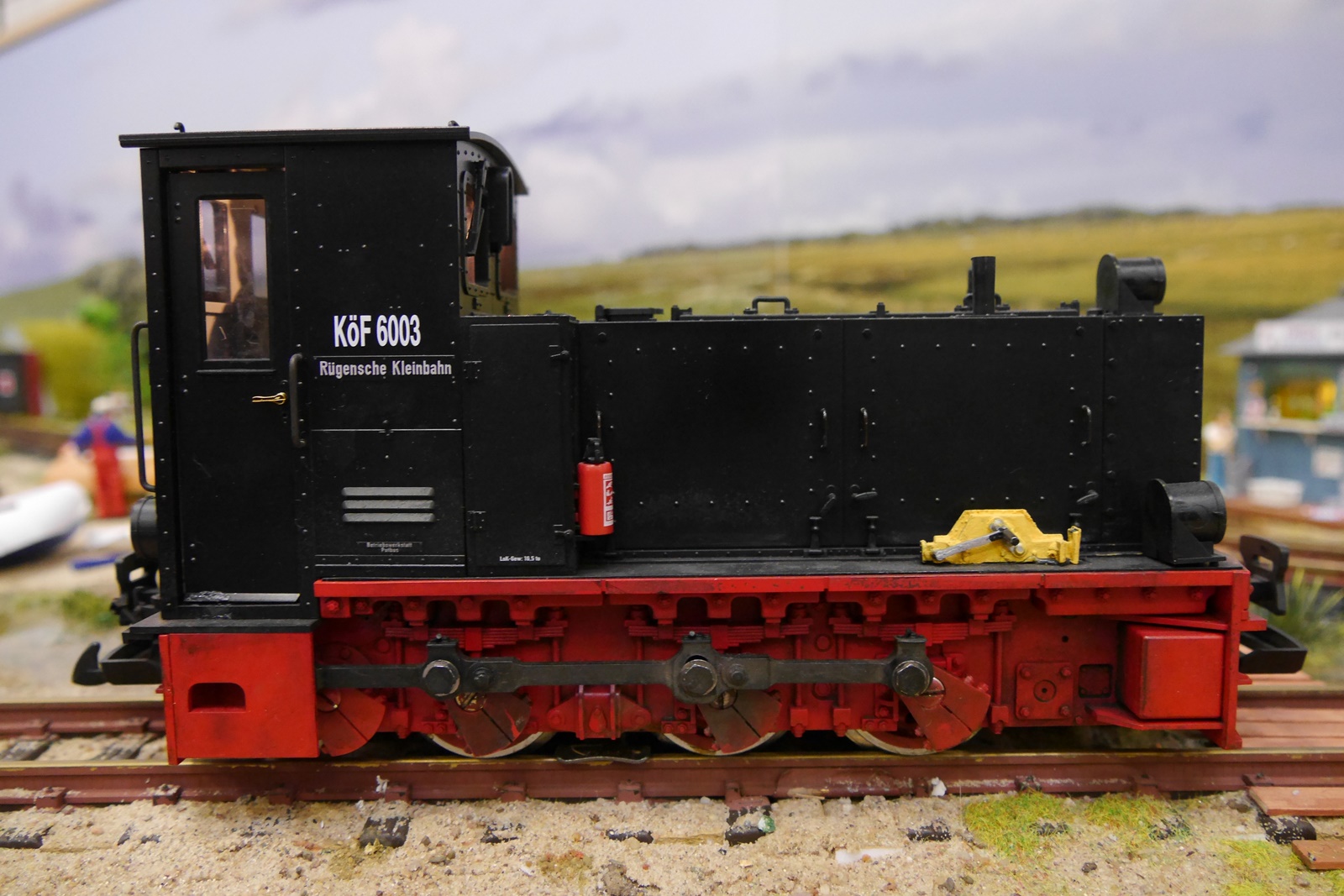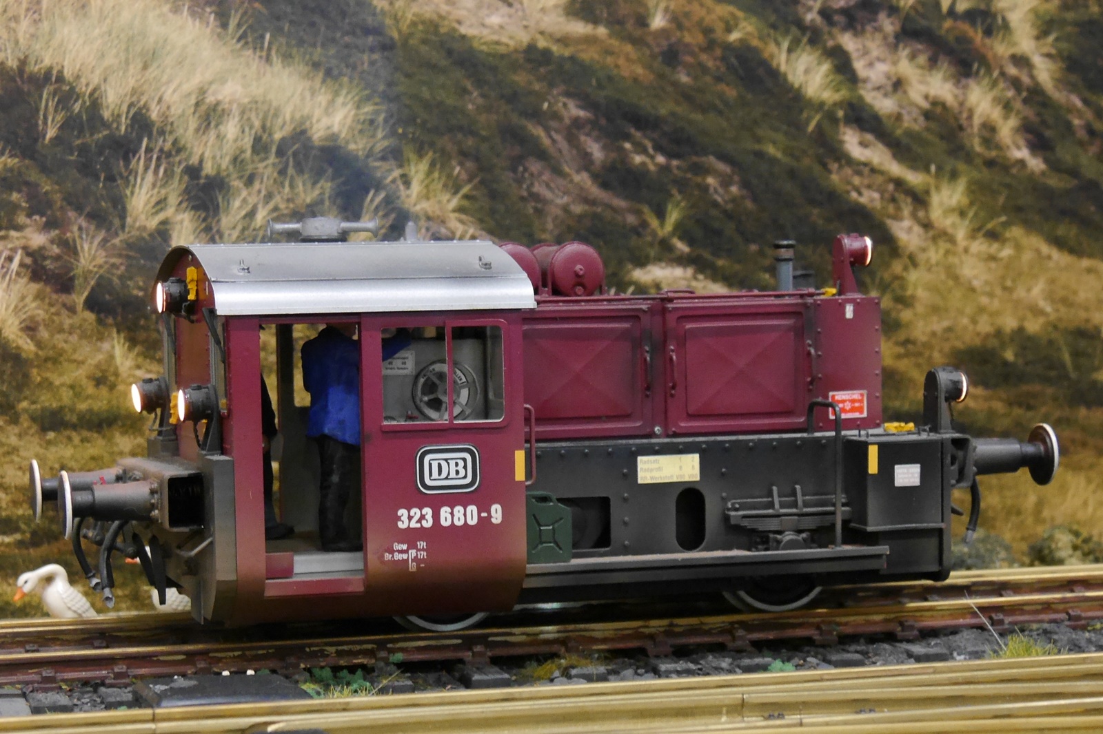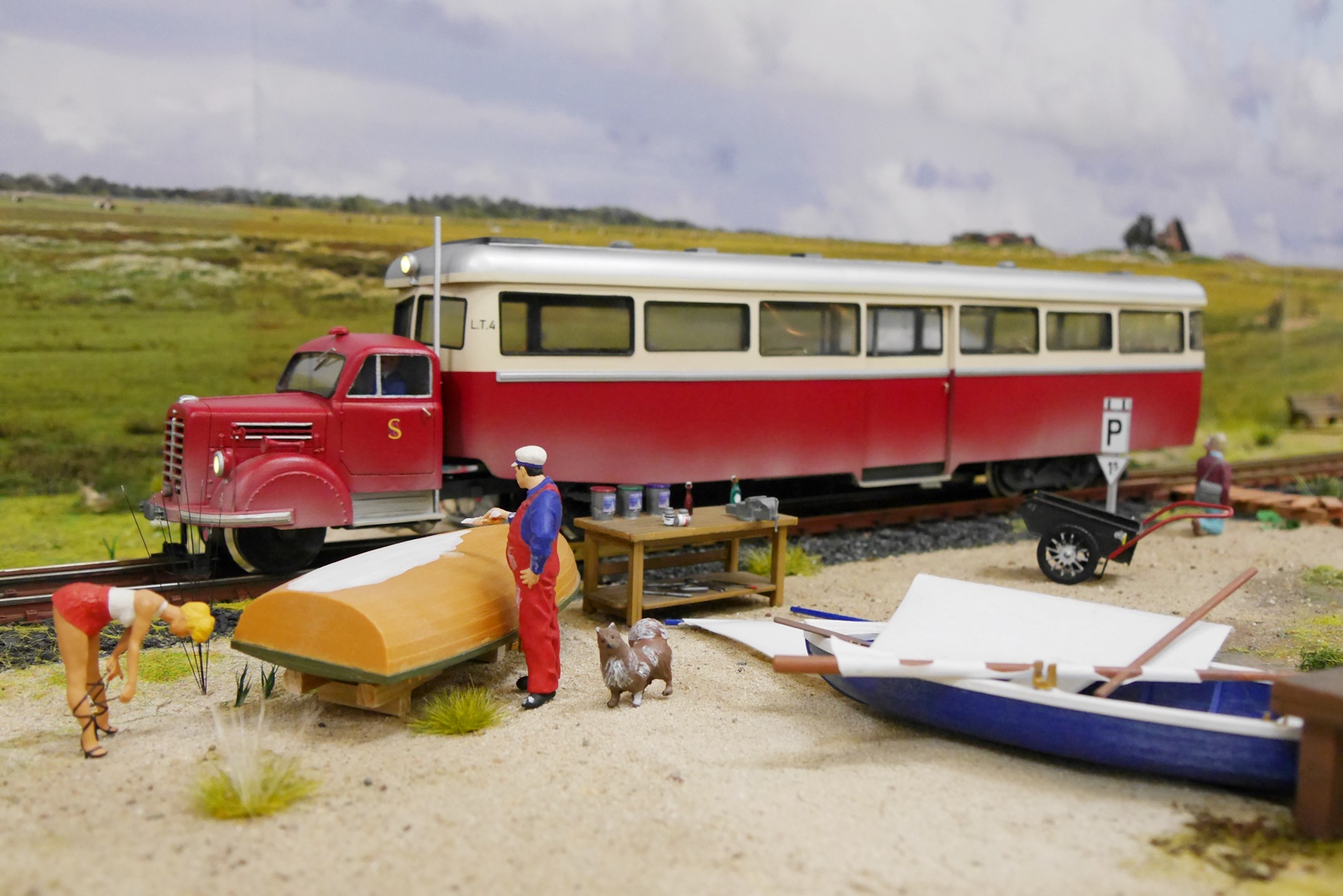 Wie so oft auf Veranstaltungen finden sich auch Gastfahrzeuge ein. Friedhelm Stuhmann (Stuhli) hat eine kleine schwarze Schmalspur-Köf, einige Inselbahnwagen (z.B. den schon bekannten Koffertransportwagen, der ganz oft zu Gast ist) und weitere Güterwagen mitgebracht. Außerdem hat er mit eigenen Modulen die Nordseeanlage um ca. 4 Meter verlängert; insbesondere die beiden Sylter Leichttriebwagen freuten sich über die Drehscheibe auf den Modulen!