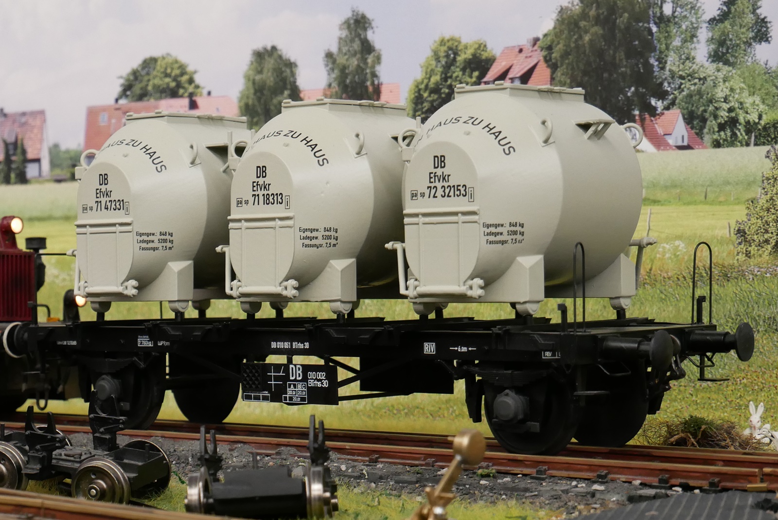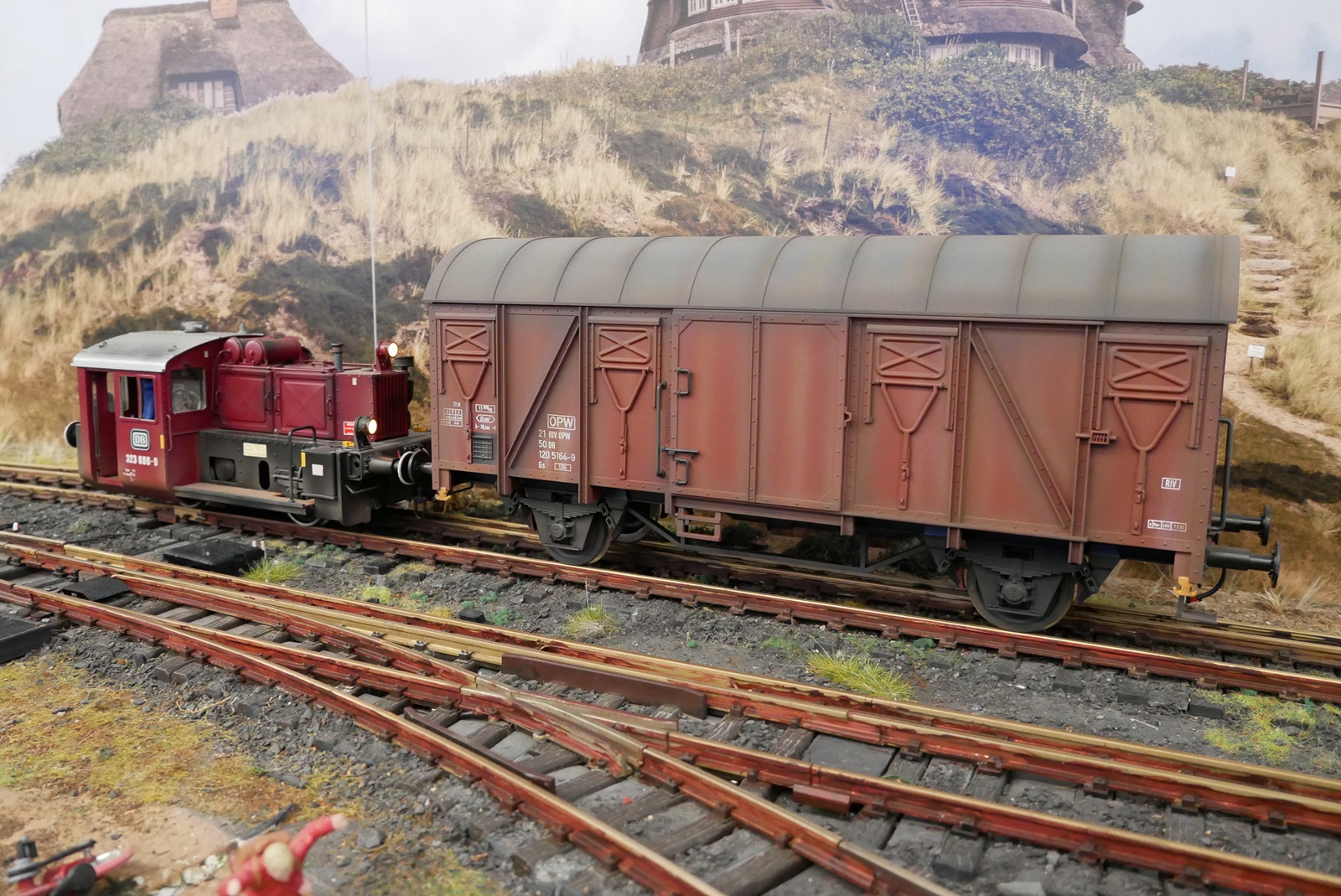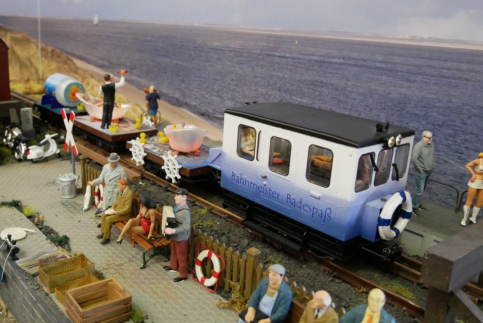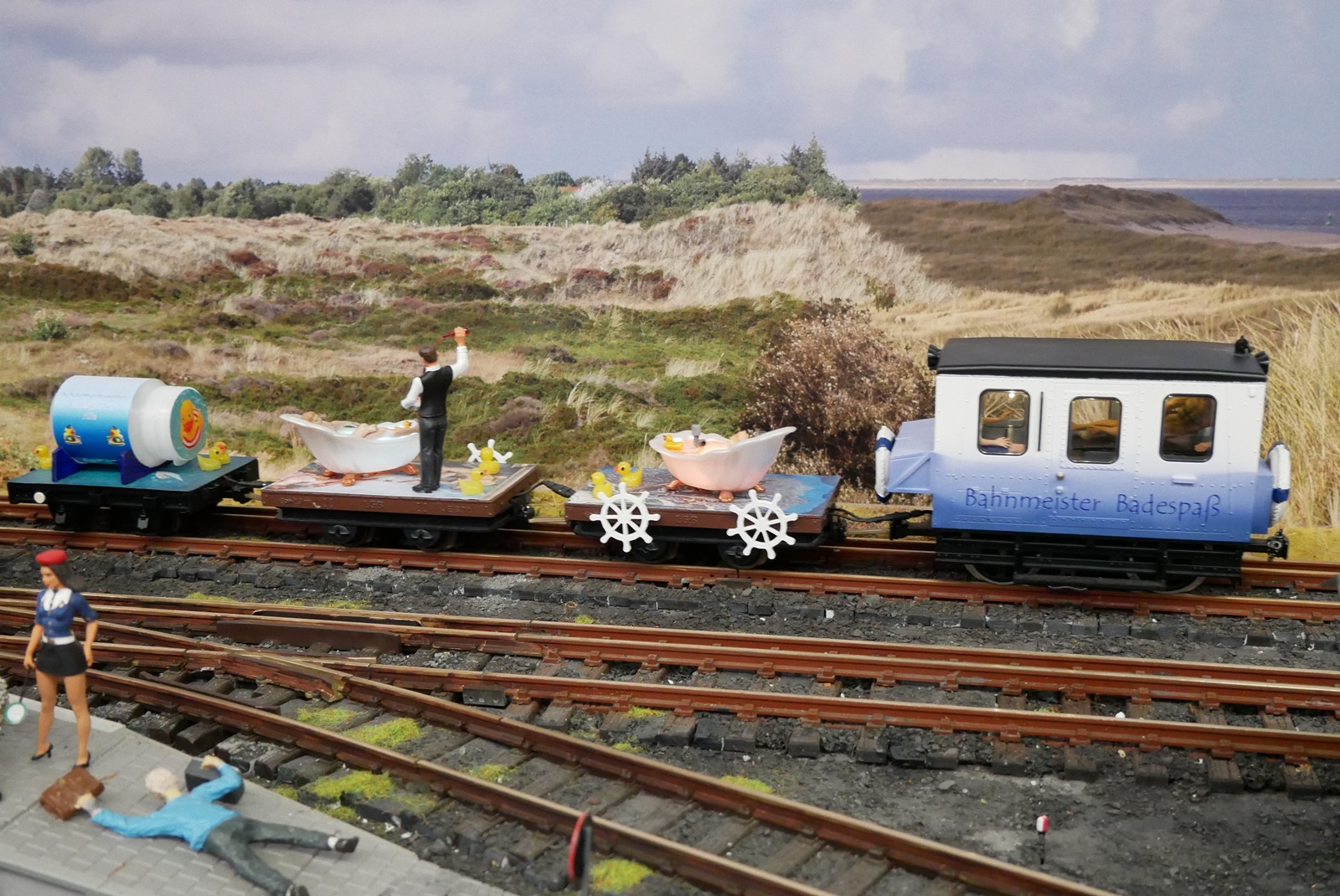 Kurze Zeit war ein Regelspurgüterwagen mit Wechselbehältern und ein lustiger "Badezug" - Erbauer Heiko Funk - zu Gast.