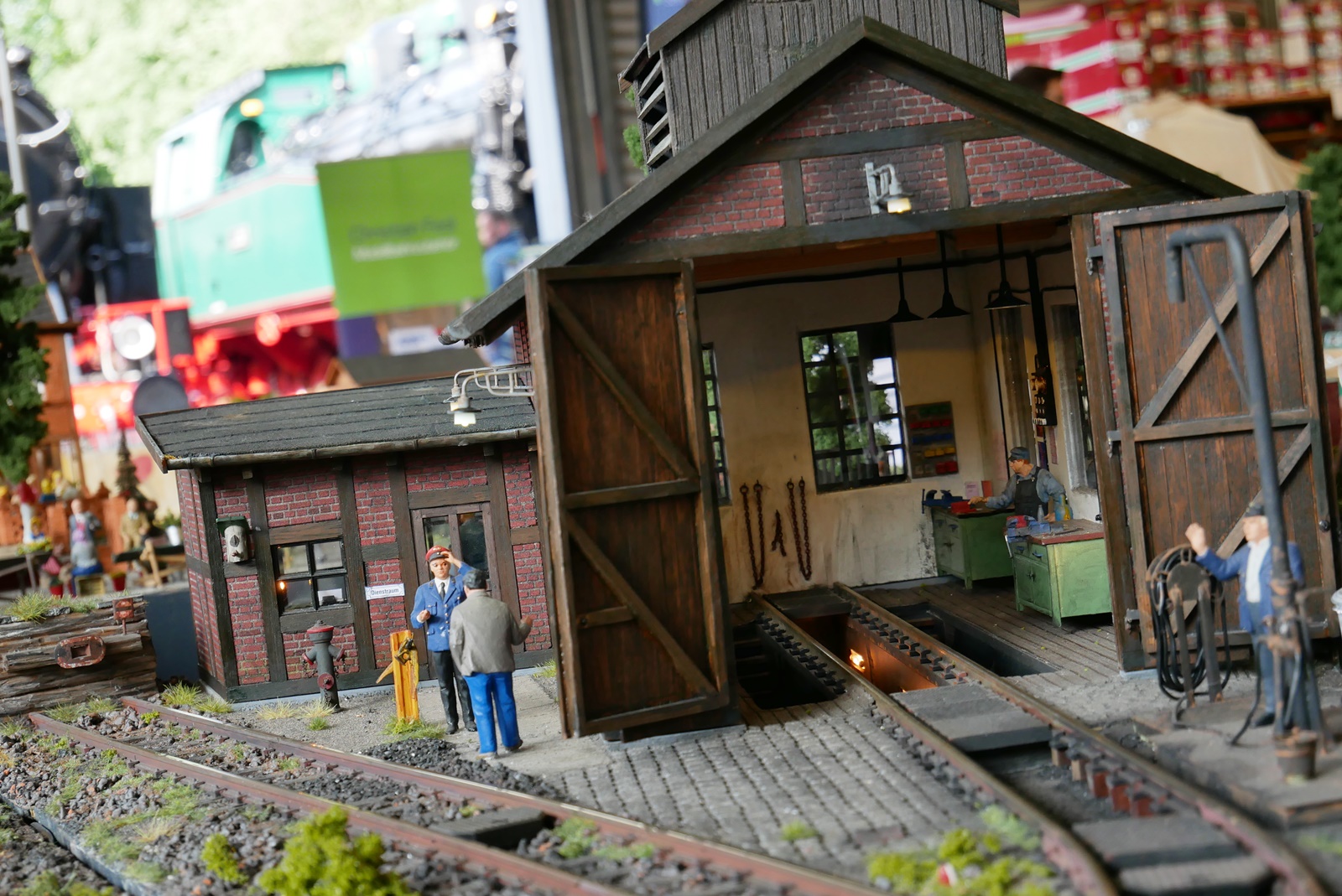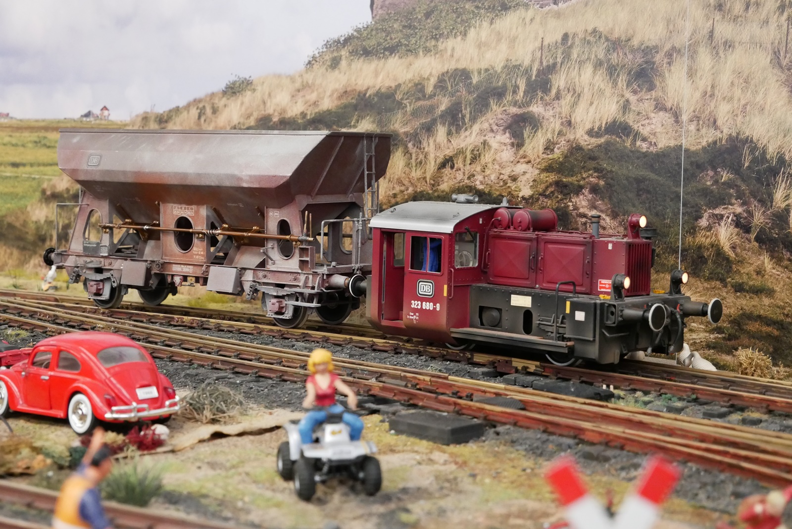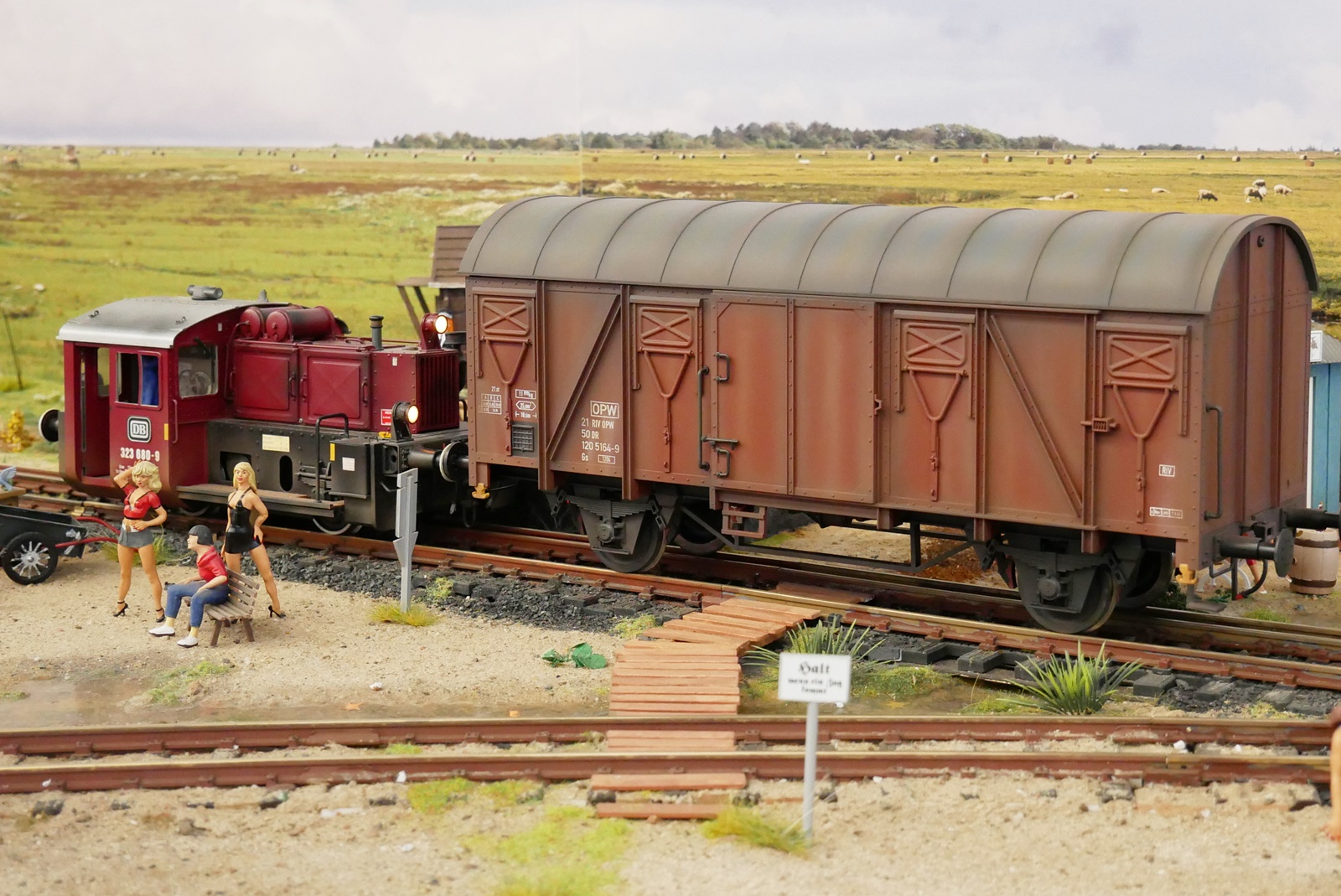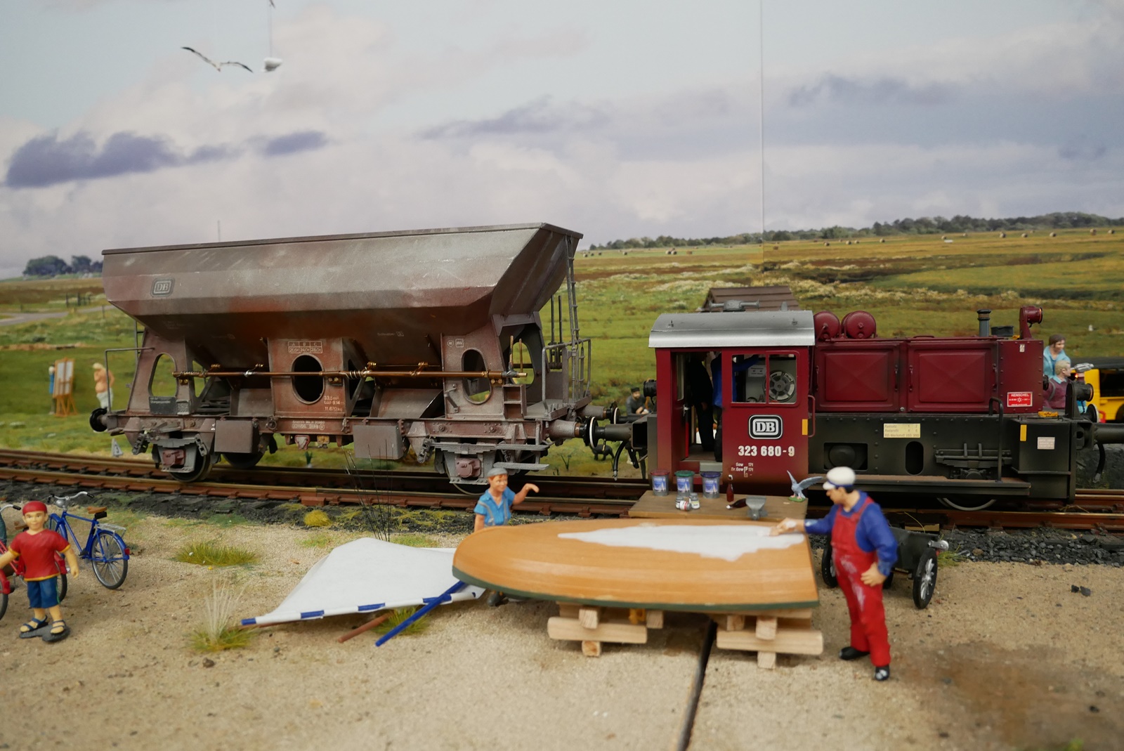 Auf der anderen Seite war das erste Mal der neue Lokschuppen zu sehen, der als einziges Bauwerk auf der Anlage das kleine BW hinterm Deich bereichert.