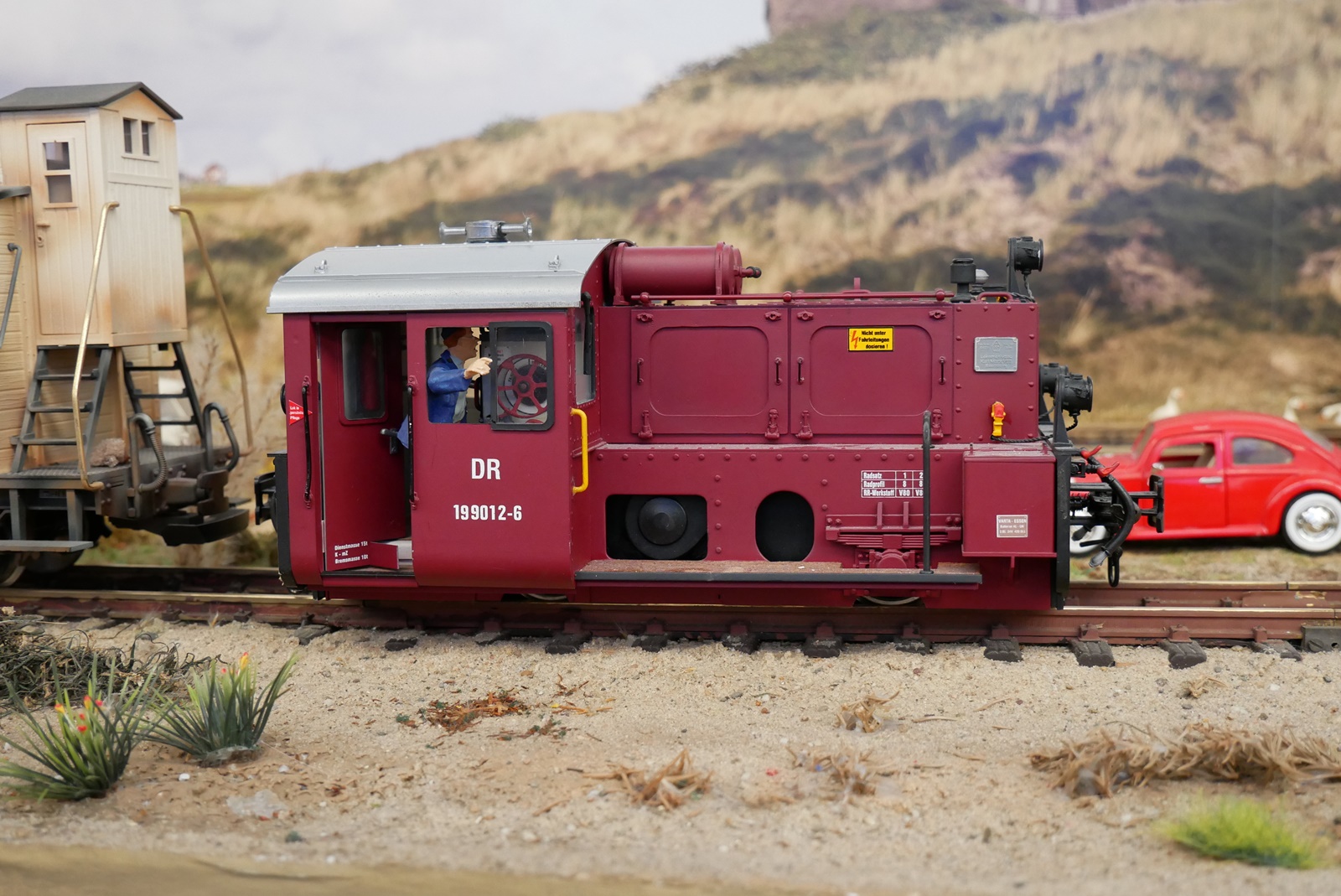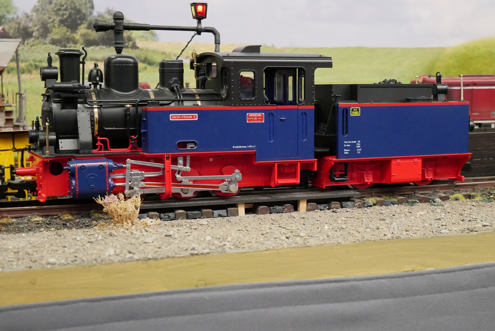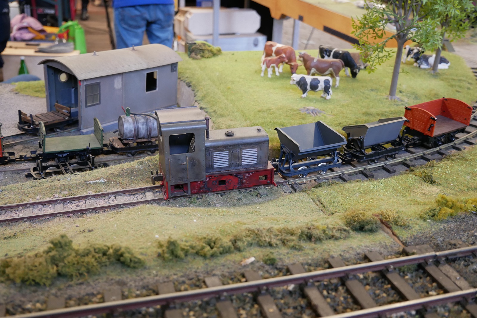 Es waren auch wieder einige Gastfahrzeuge auf der Anlage unterwegs. Torsten Appeltrat, der wieder fleissig geholfen hat, hatte einen Schotterwagen (Regelspur / 64 mm), eine Köf auf Meterspur, seine VI K und den Schlepptriebwagen mitgebracht.