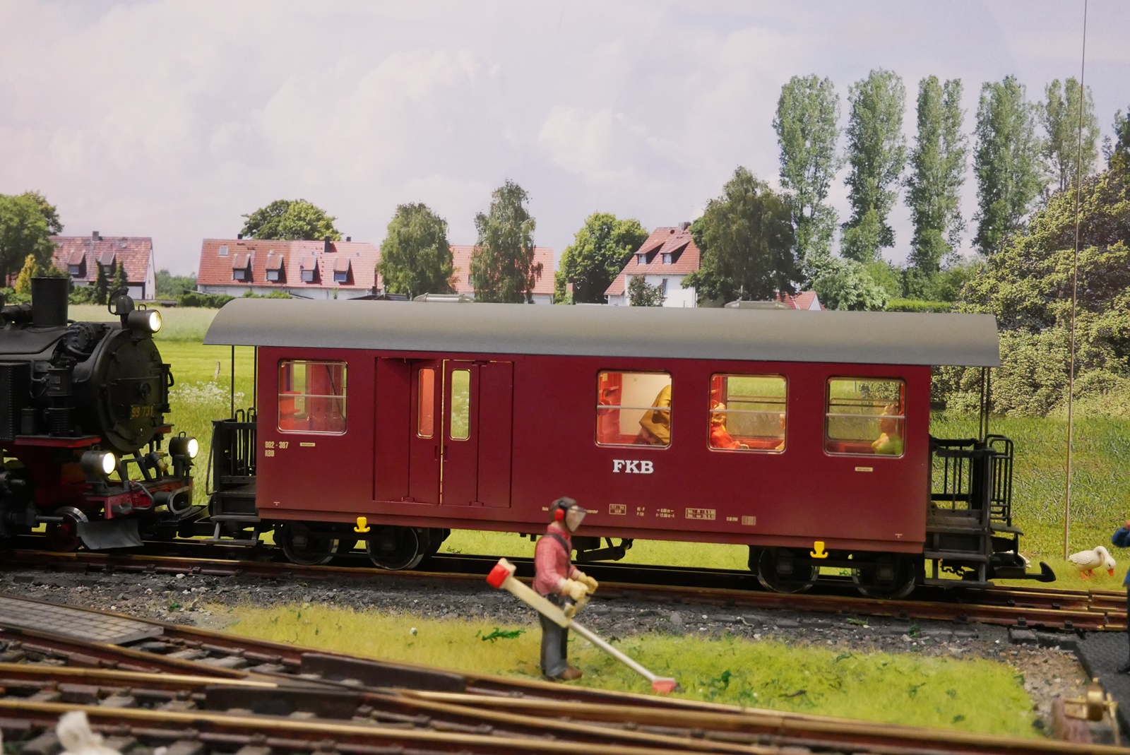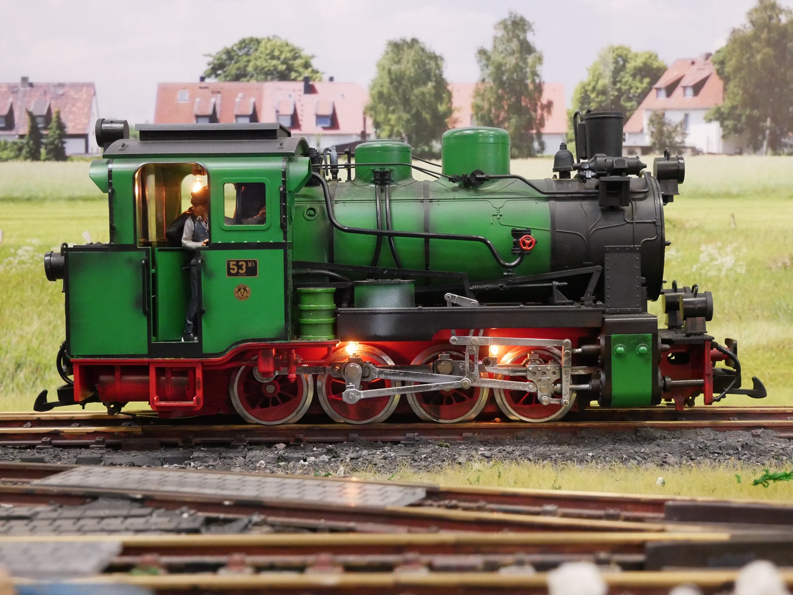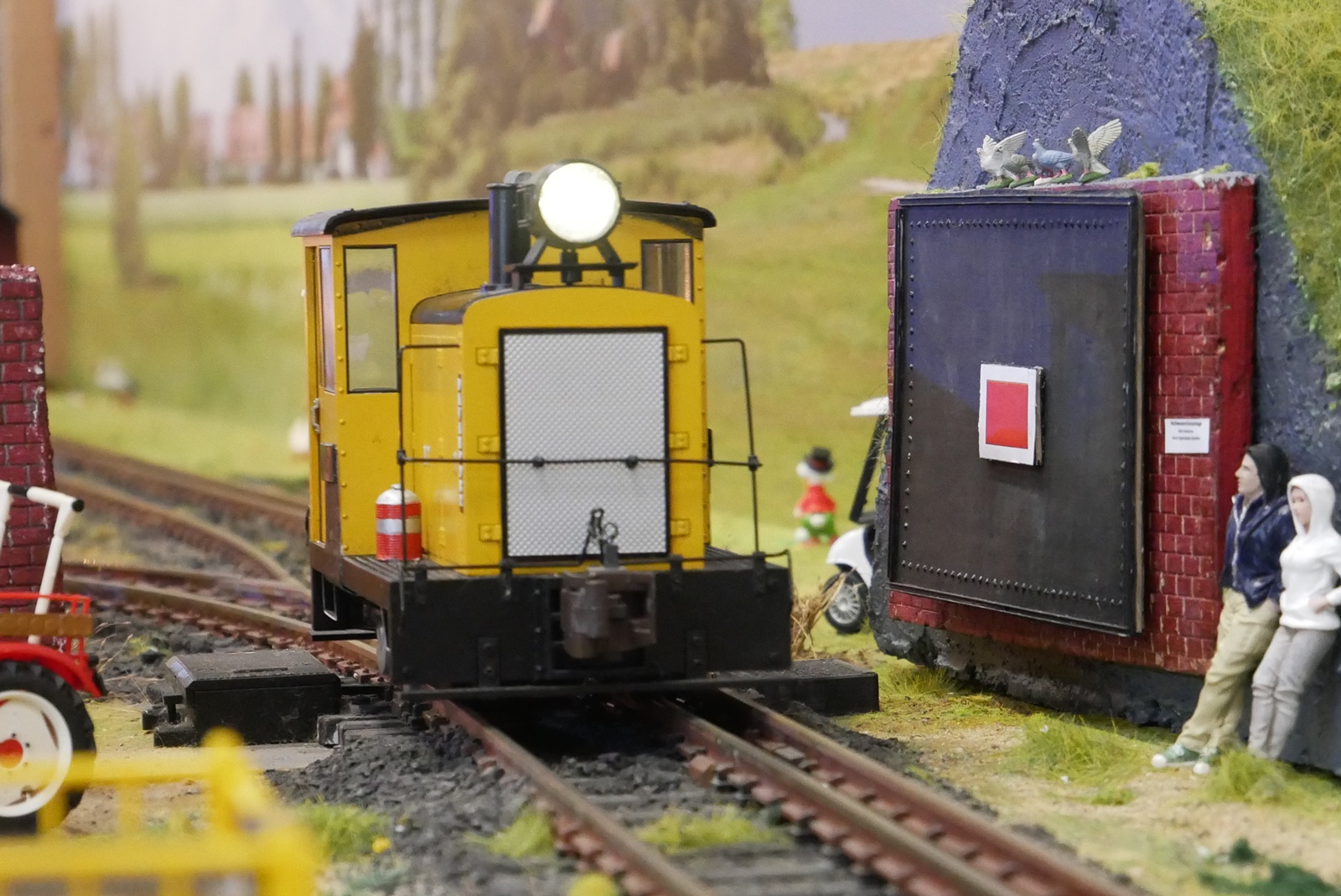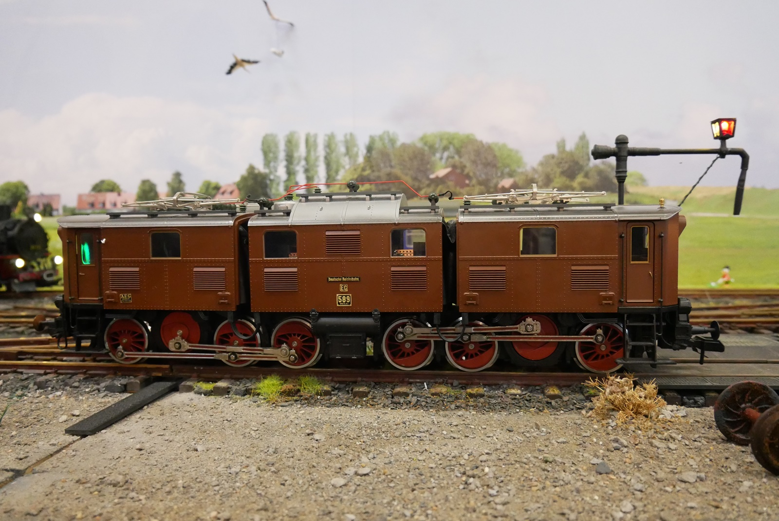 Ein Altbau-E-Lok in Spur 1 von Dieter Oehme war zu einer Probefahrt auf der Anlage unterwegs; ebenso ein Güterwagen von Stefan Heussen, der einen Rangierer mit leuchtender Lampe hatte.