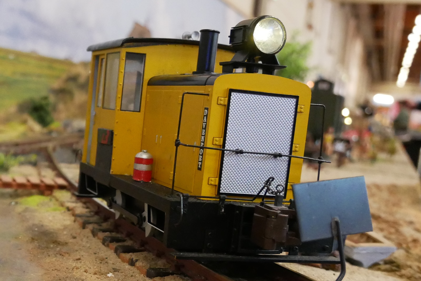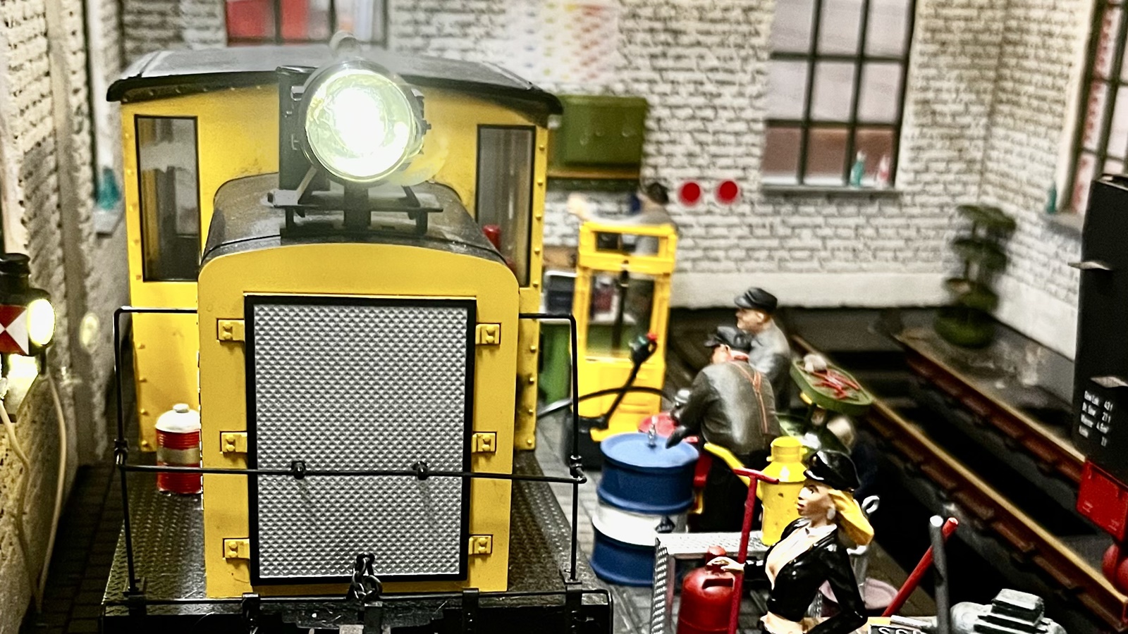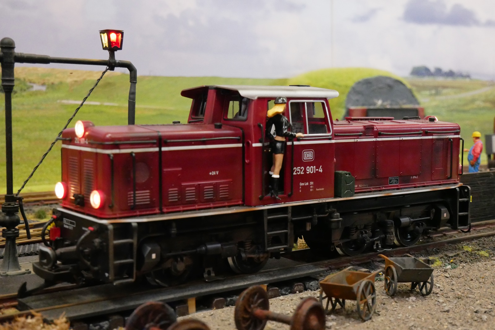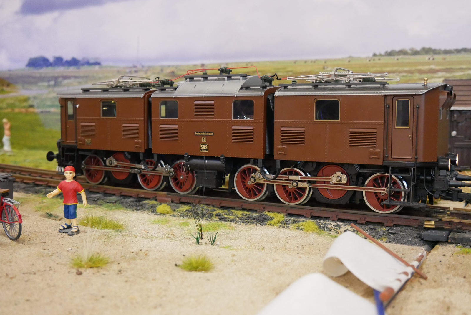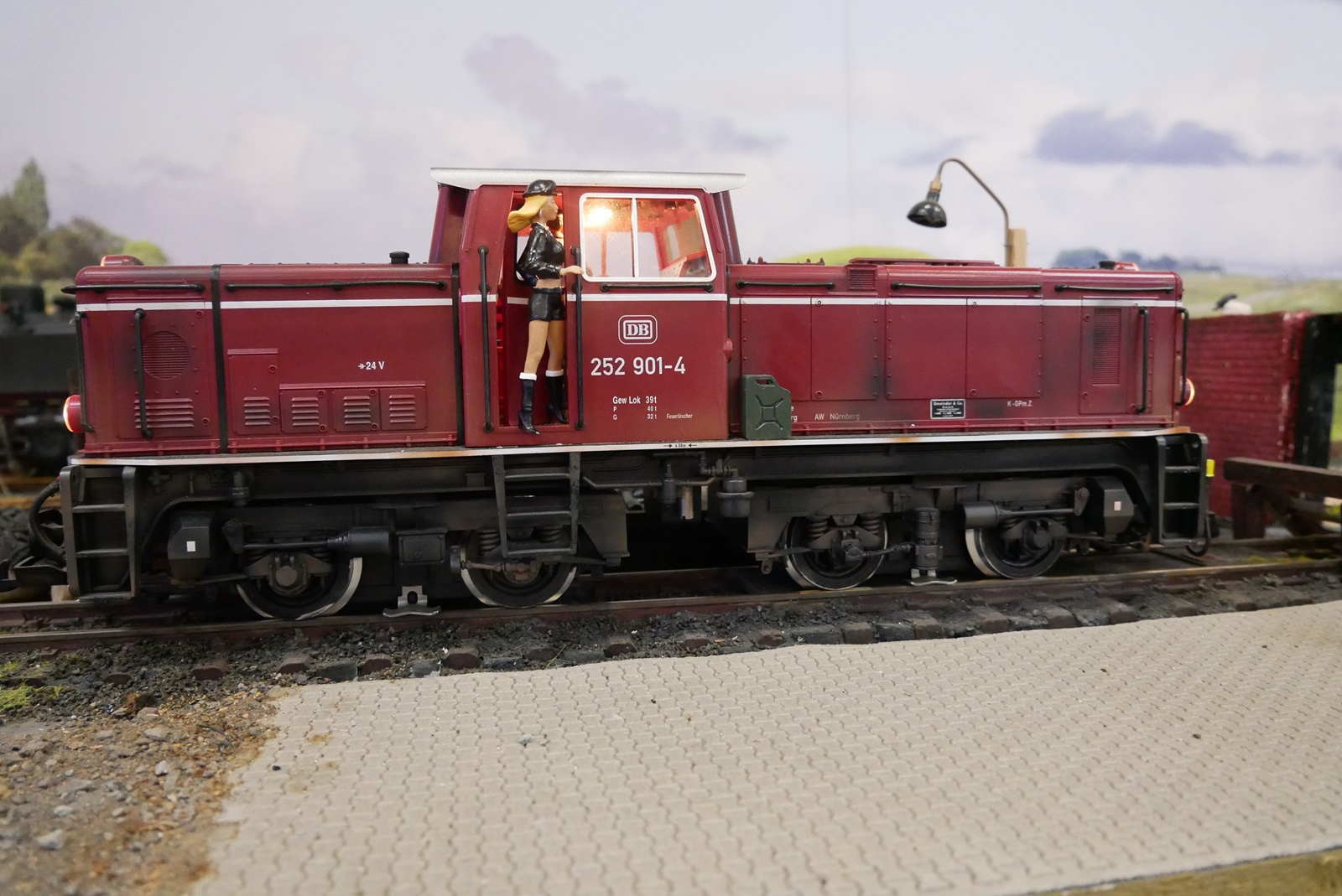 Ein Altbau-E-Lok in Spur 1 von Dieter Oehme war zu einer Probefahrt auf der Anlage unterwegs; ebenso ein Güterwagen von Stefan Heussen, der einen Rangierer mit leuchtender Lampe hatte.