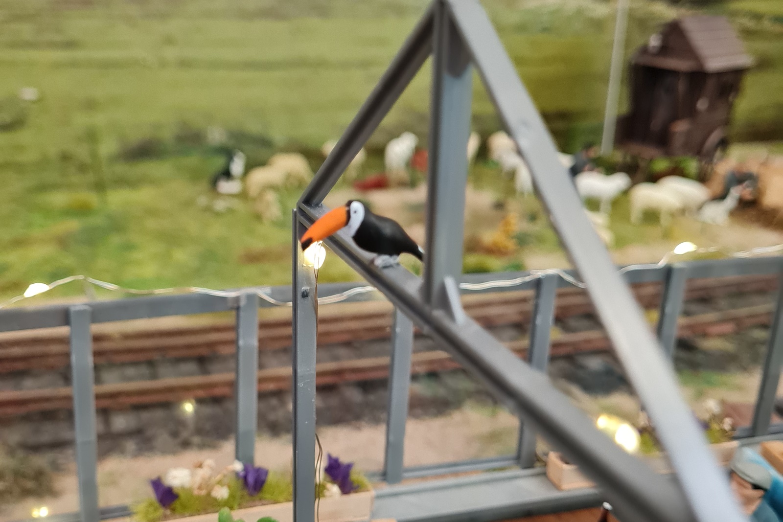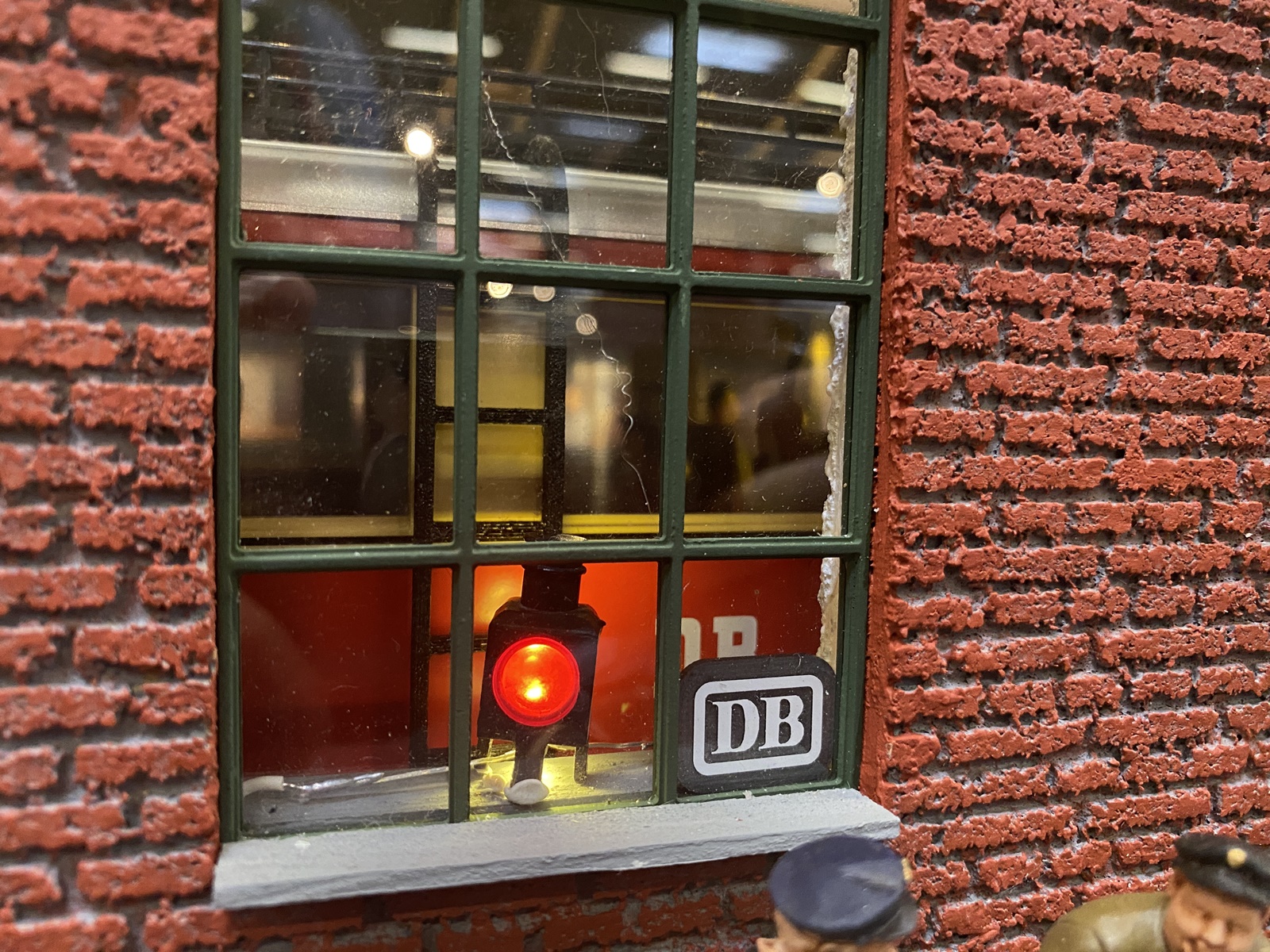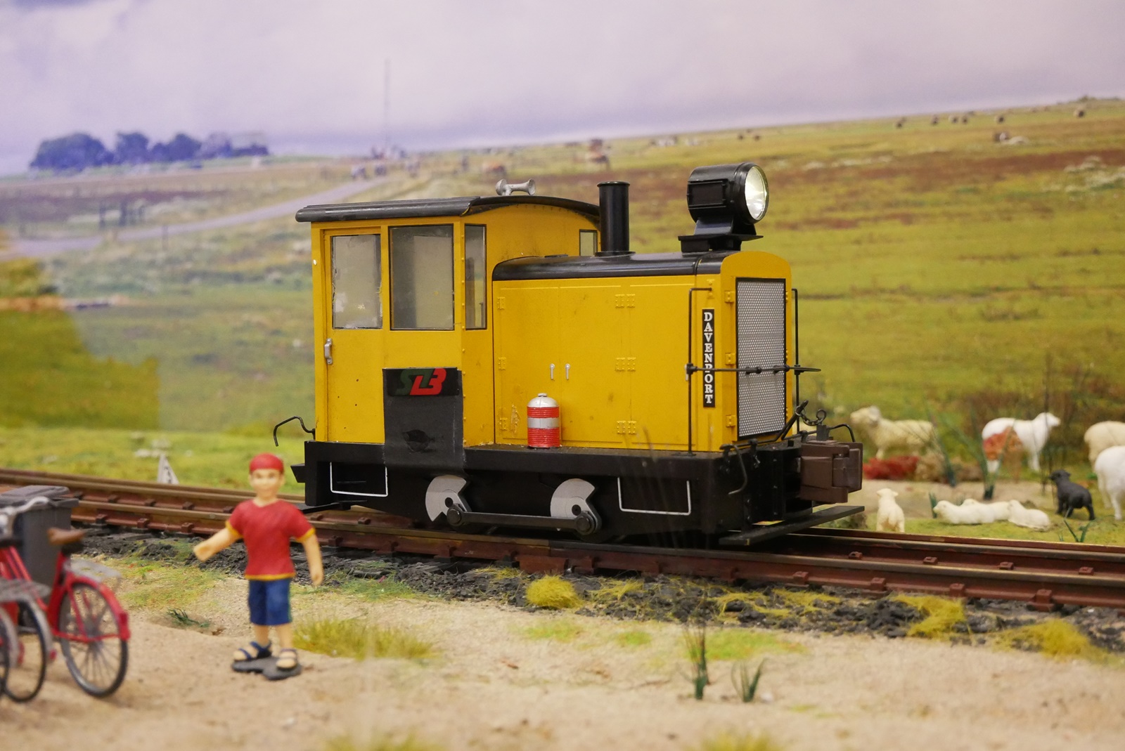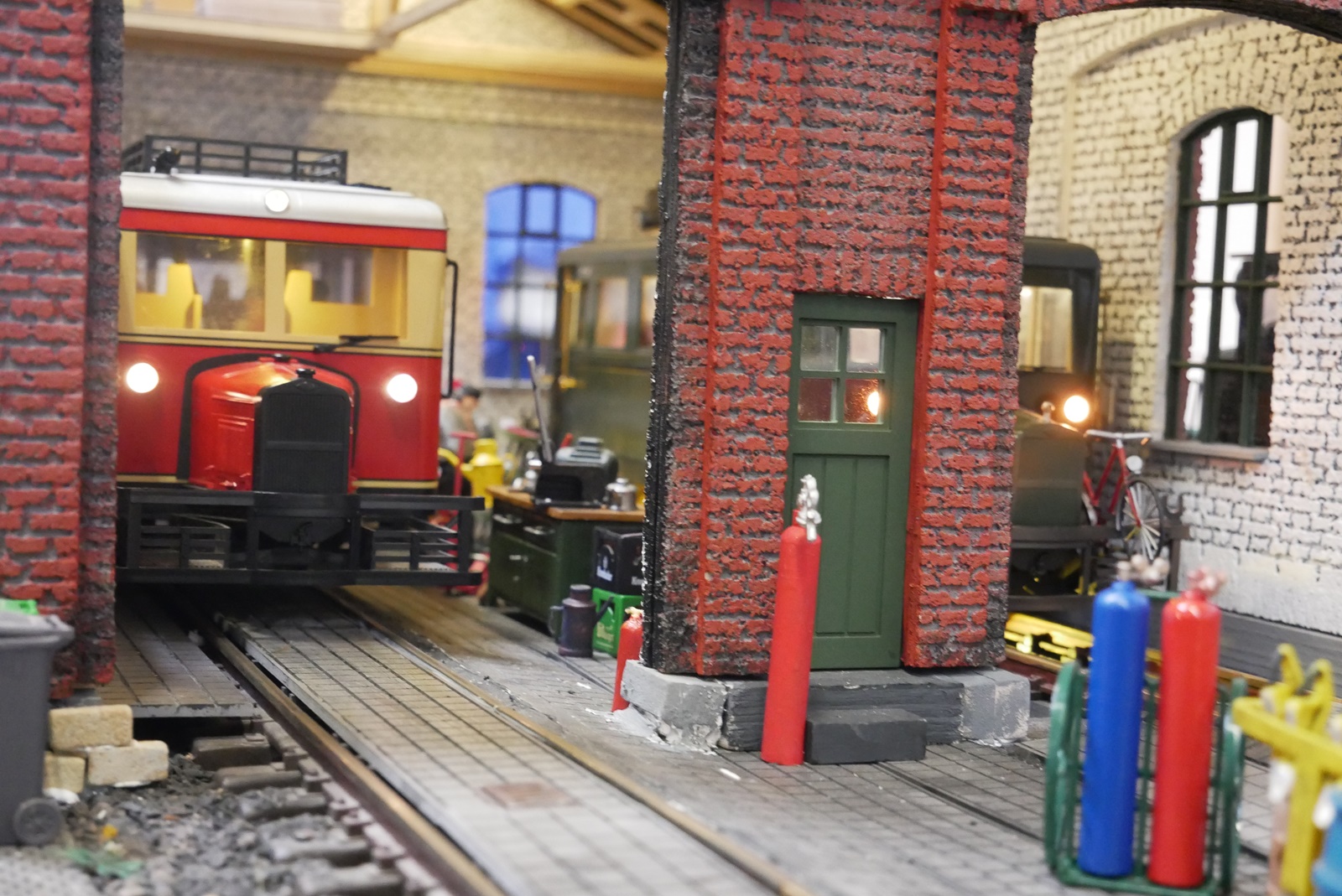 Ein Altbau-E-Lok in Spur 1 von Dieter Oehme war zu einer Probefahrt auf der Anlage unterwegs; ebenso ein Güterwagen von Stefan Heussen, der einen Rangierer mit leuchtender Lampe hatte.